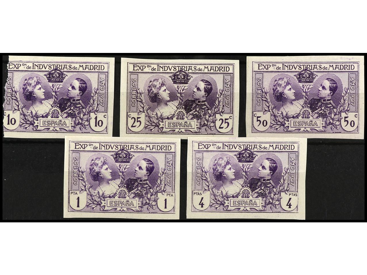 ESPAÑA. EXPO INDUSTRIAS DE MADRID. ENSAYOS DE COLOR. Juego completo de 5 valores en color violeta. Sello de 10 cts. defecto. (Image1)