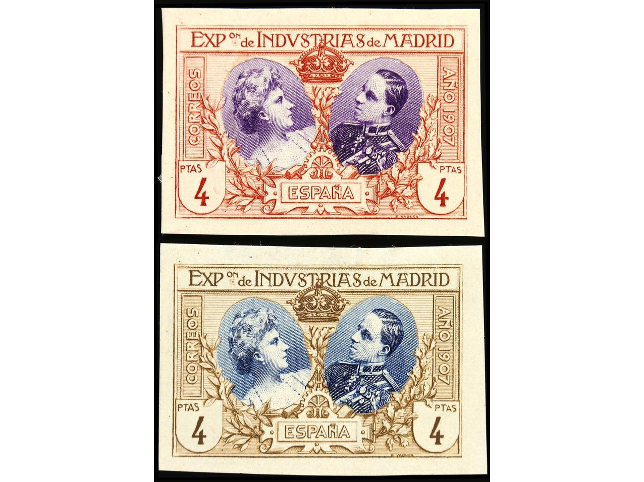 ESPAÑA. EXPO. INDUSTRIAS DE MADRID. ENSAYOS DE COLOR. 4 pts. rojo y violeta y 4 pts. castaño y azul. No reseñados. RAROS. (Image1) (Image2)