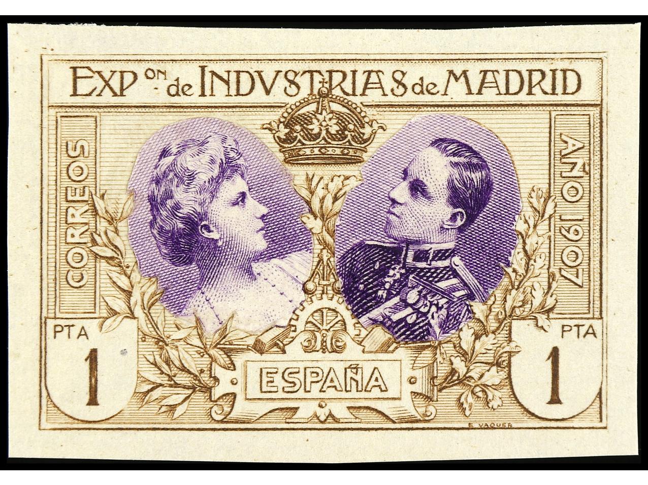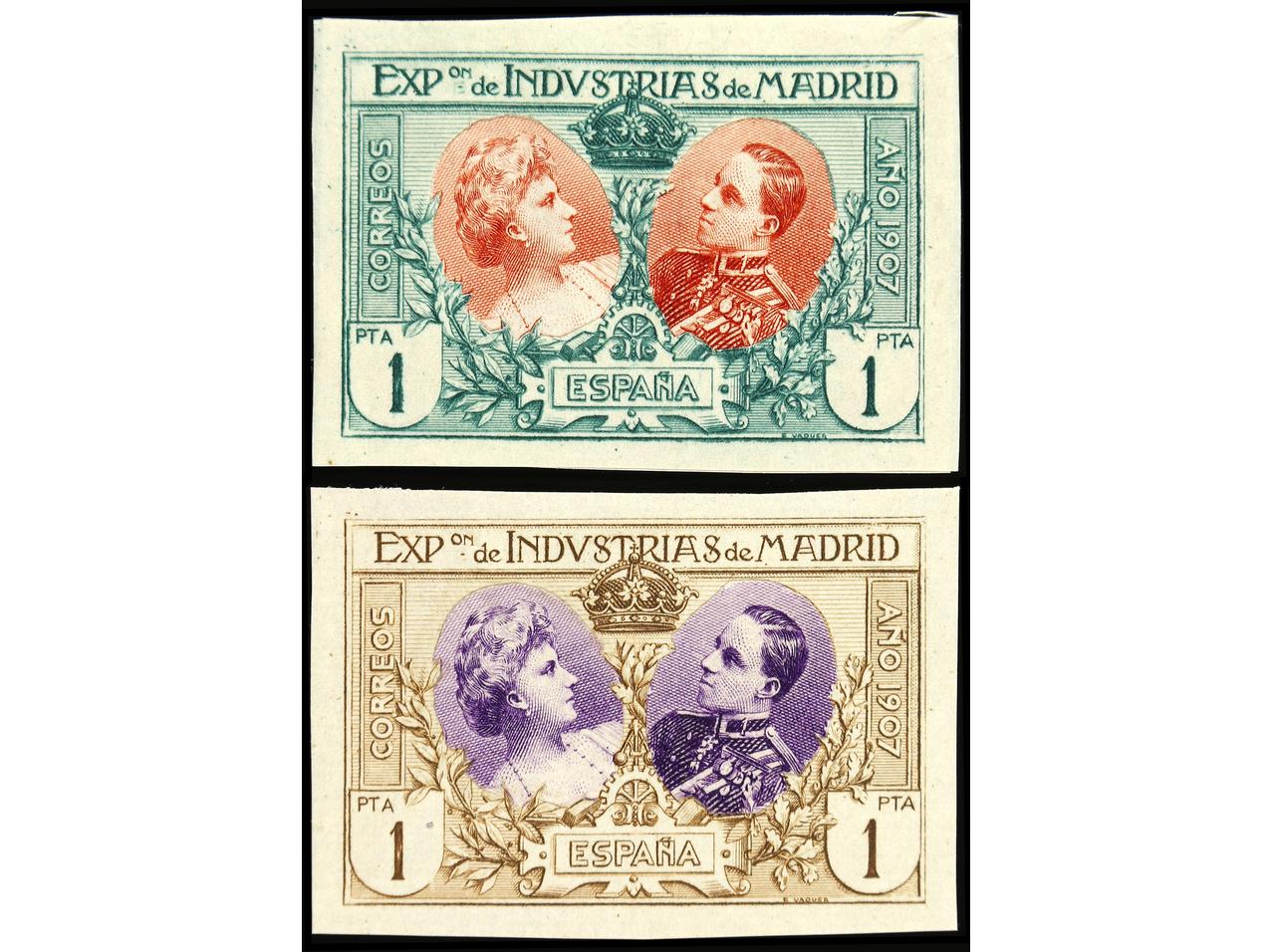 ESPAÑA. EXPO. INDUSTRIAS DE MADRID. ENSAYOS DE COLOR. 1 pta. verde y rojo y 1 pta. castaño y violeta. No reseñados. RAROS. (Image1) (Image2)