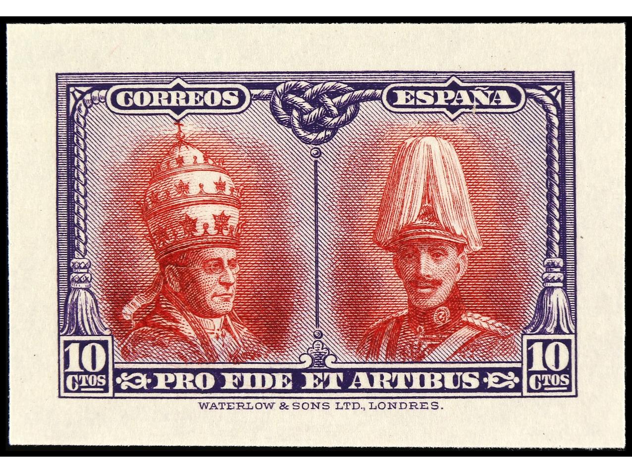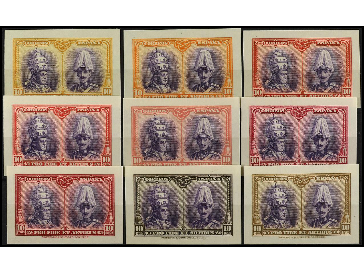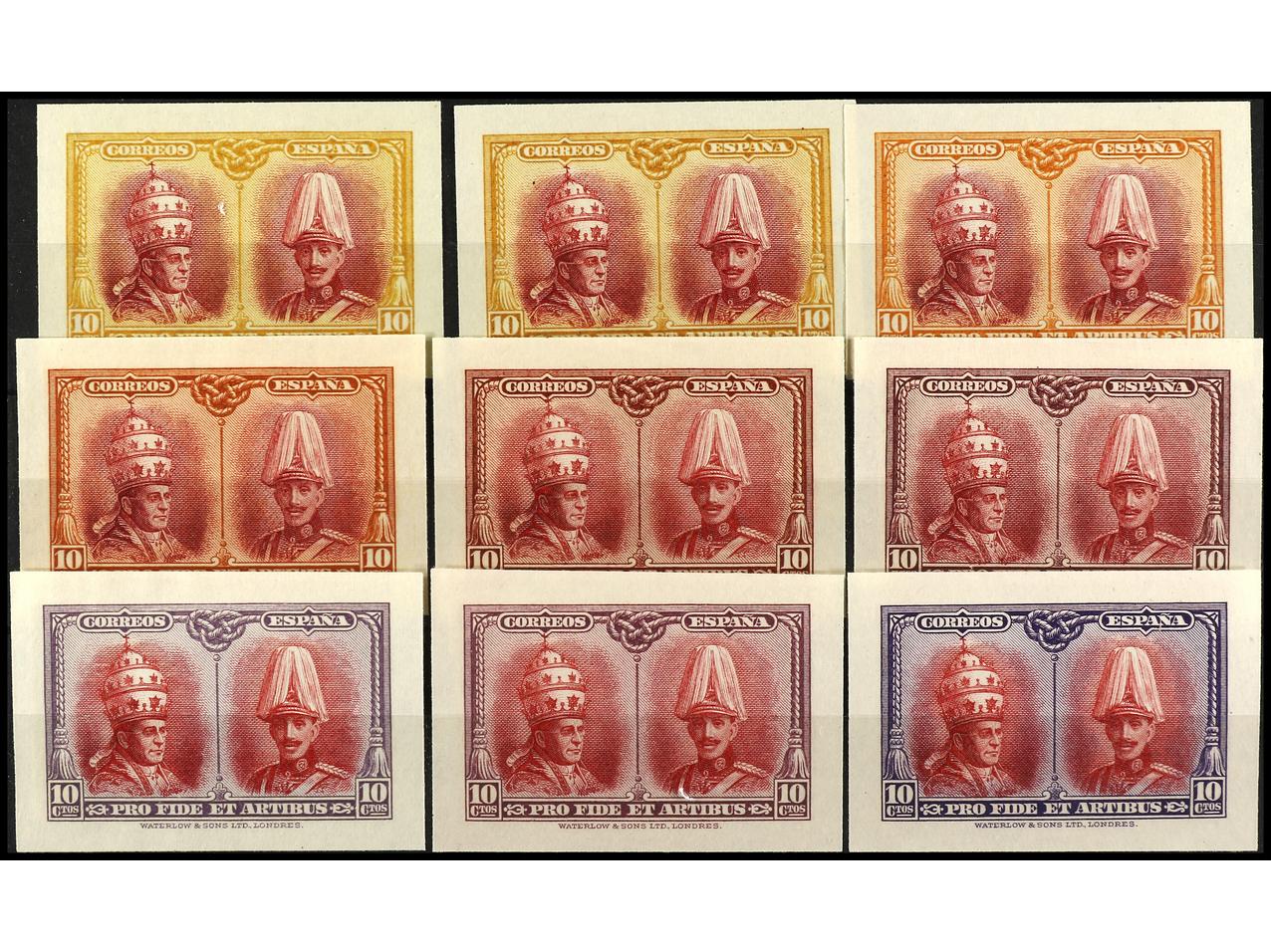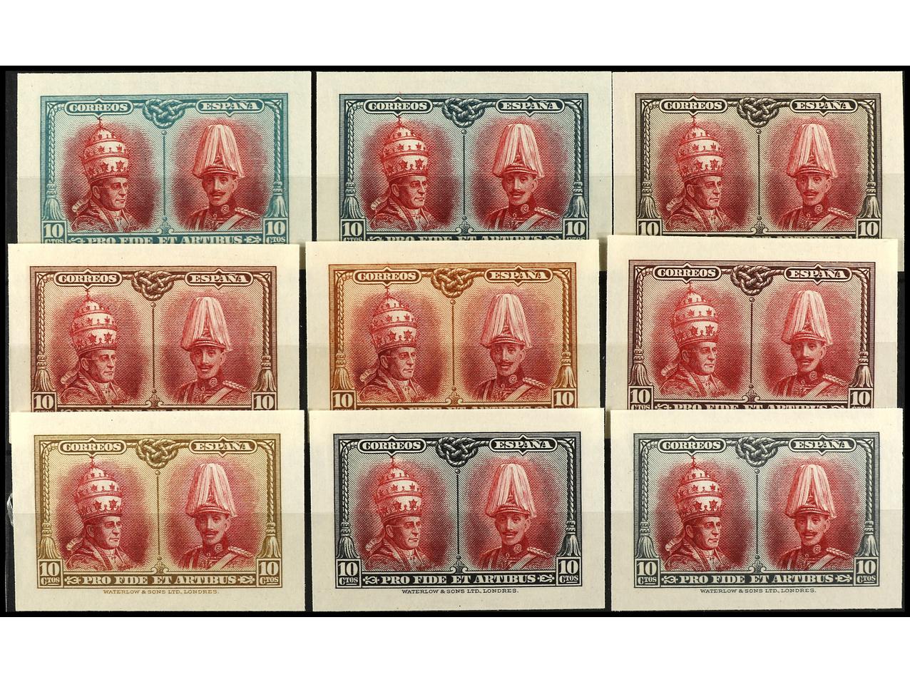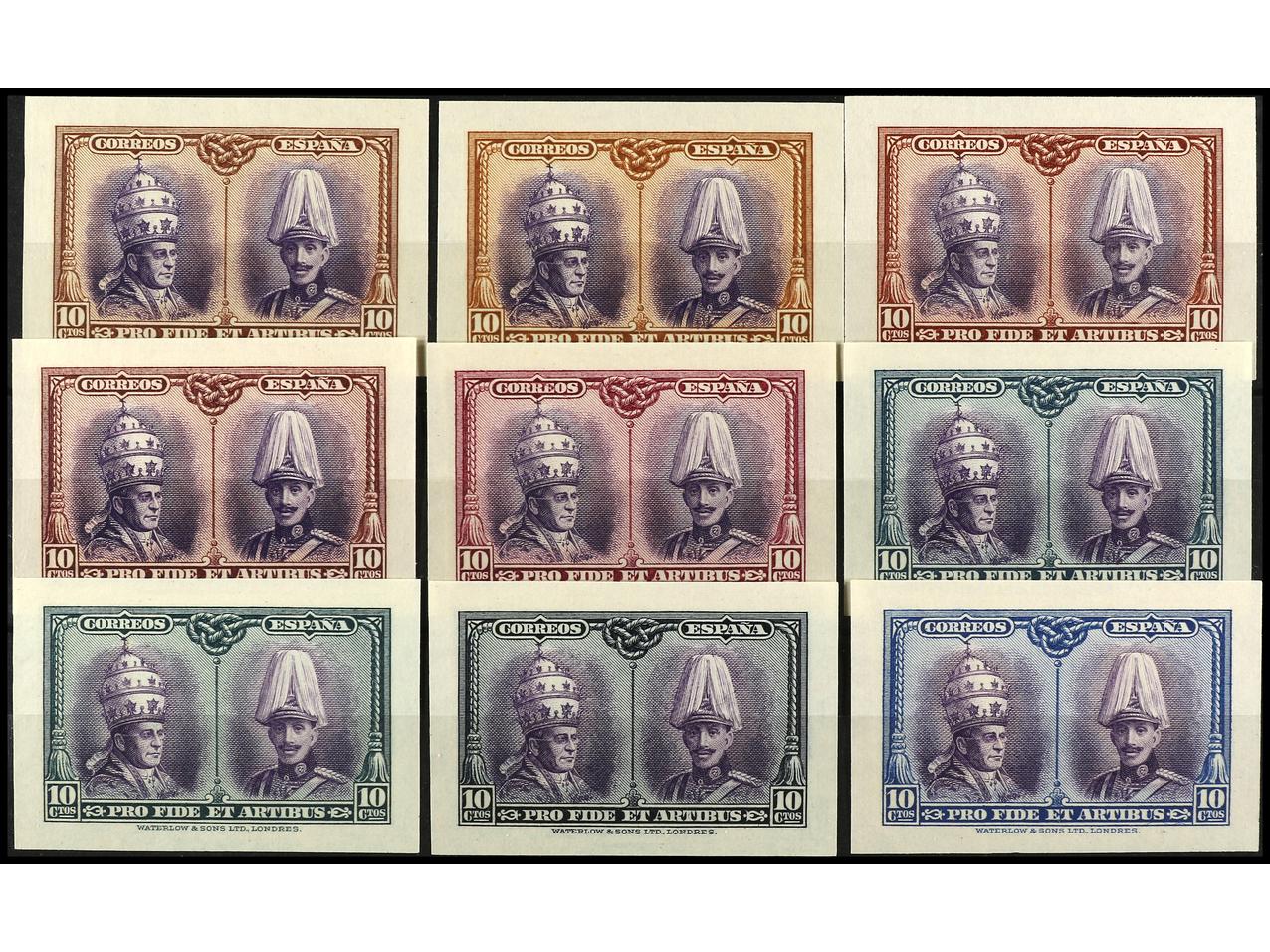 ESPAÑA. CATACUMBAS. ENSAYOS DE COLOR. Conjunto de 26 ensayos del sello de 10 cts. con los centros en carmín y los marcos en todas las tonalidades de color conocidas (faltan una del rojo, dos del azul y una del ultramar). MUY RARAS.