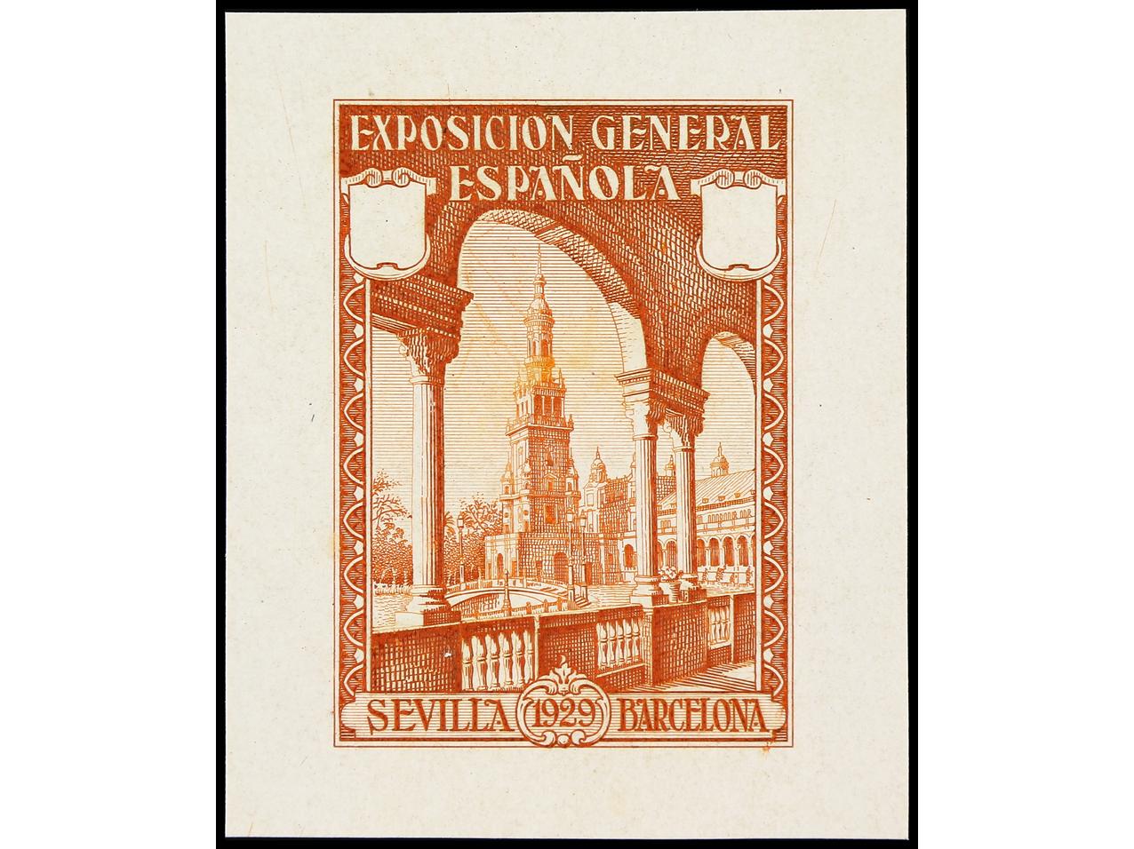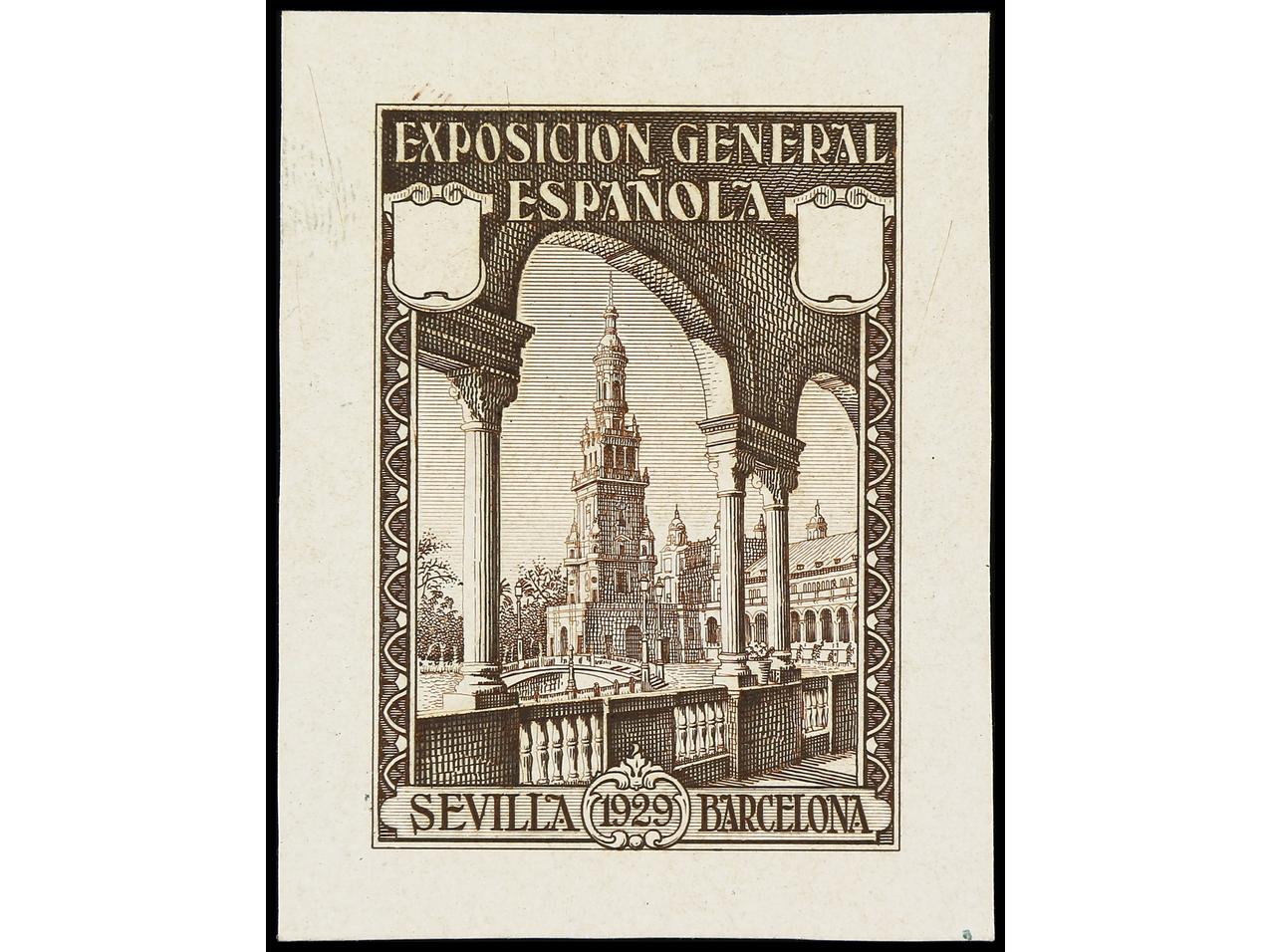ESPAÑA. EXPO. SEVILLA y BARCELONA. PRUEBA DE PUNZÓN. Sin el valor y sin nubes en el cielo en color castaño sobre papel estucado. (Gálvez 2376).