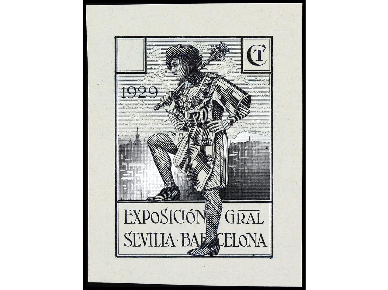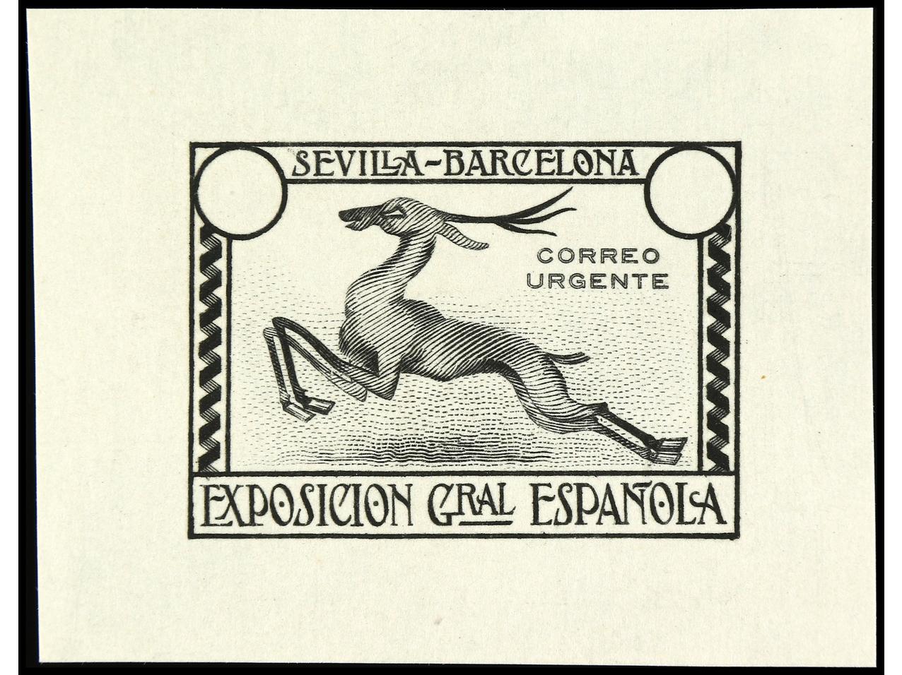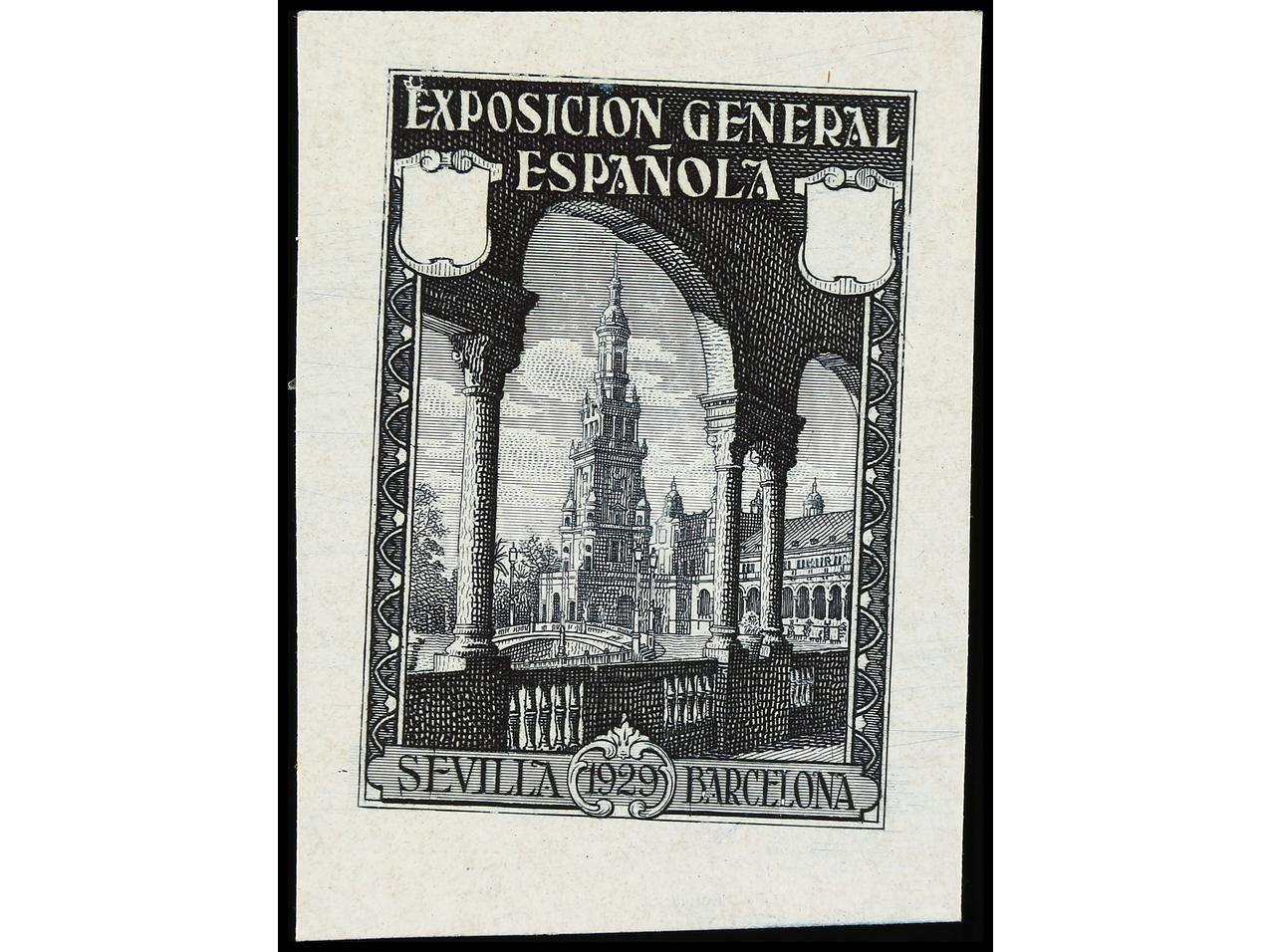 ESPAÑA. EXPO. SEVILLA y BARCELONA. PRUEBA DE PUNZÓN. Sin el valor y con nubes en el cielo en color negro sobre cartulina estucada. (Gálvez 2373).