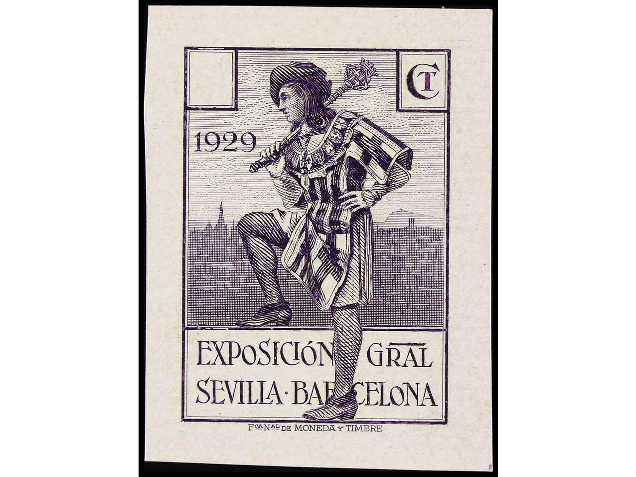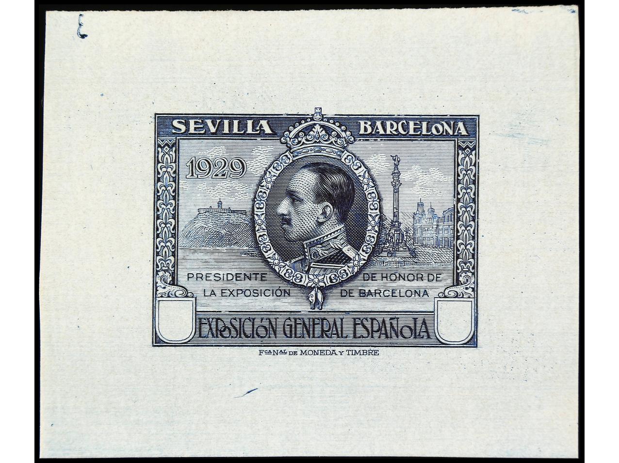 ESPAÑA. EXPO. SEVILLA y BARCELONA. PRUEBA DE PUNZÓN sin el valor en color azul sin pie de imprenta sobre papel estucado. (Gálvez 2367). (Image1)