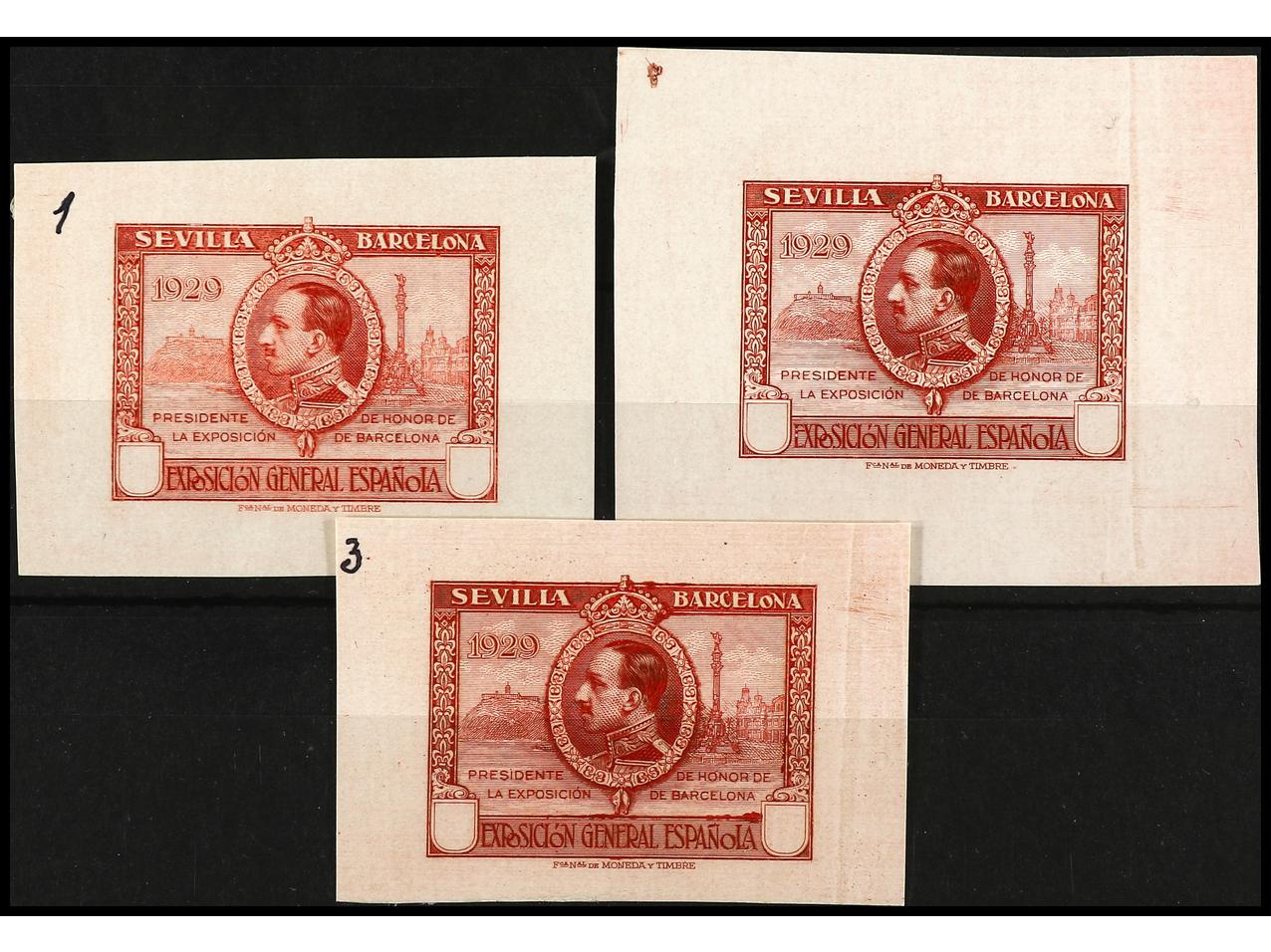 ESPAÑA. EXPO. SEVILLA y BARCELONA. PRUEBAS DE PUNZÓN. 3 pruebas sin el valor en carmín (distintos tonos) sobre papel estucado. (Gálvez 2380).