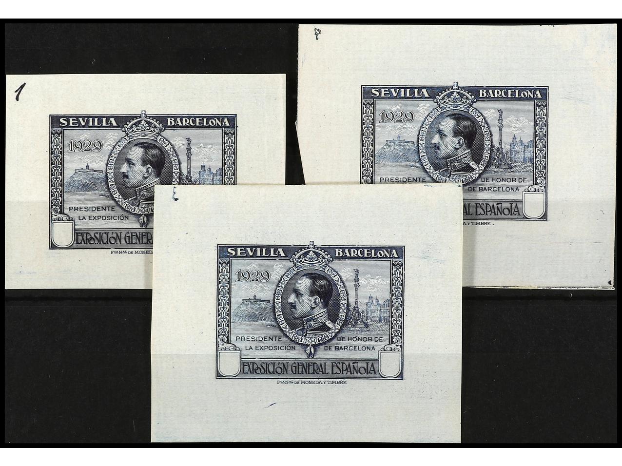ESPAÑA. EXPO. SEVILLA y BARCELONA. PRUEBAS DE PUNZÓN. 3 pruebas sin el valor en azul (distintos tonos) sobre papel estucado. (Gálvez 2379).