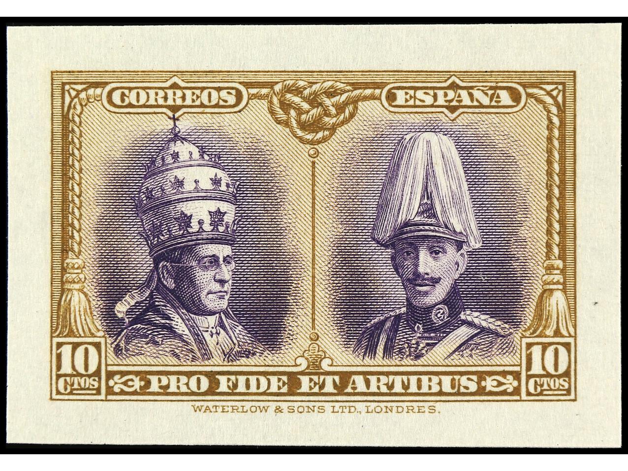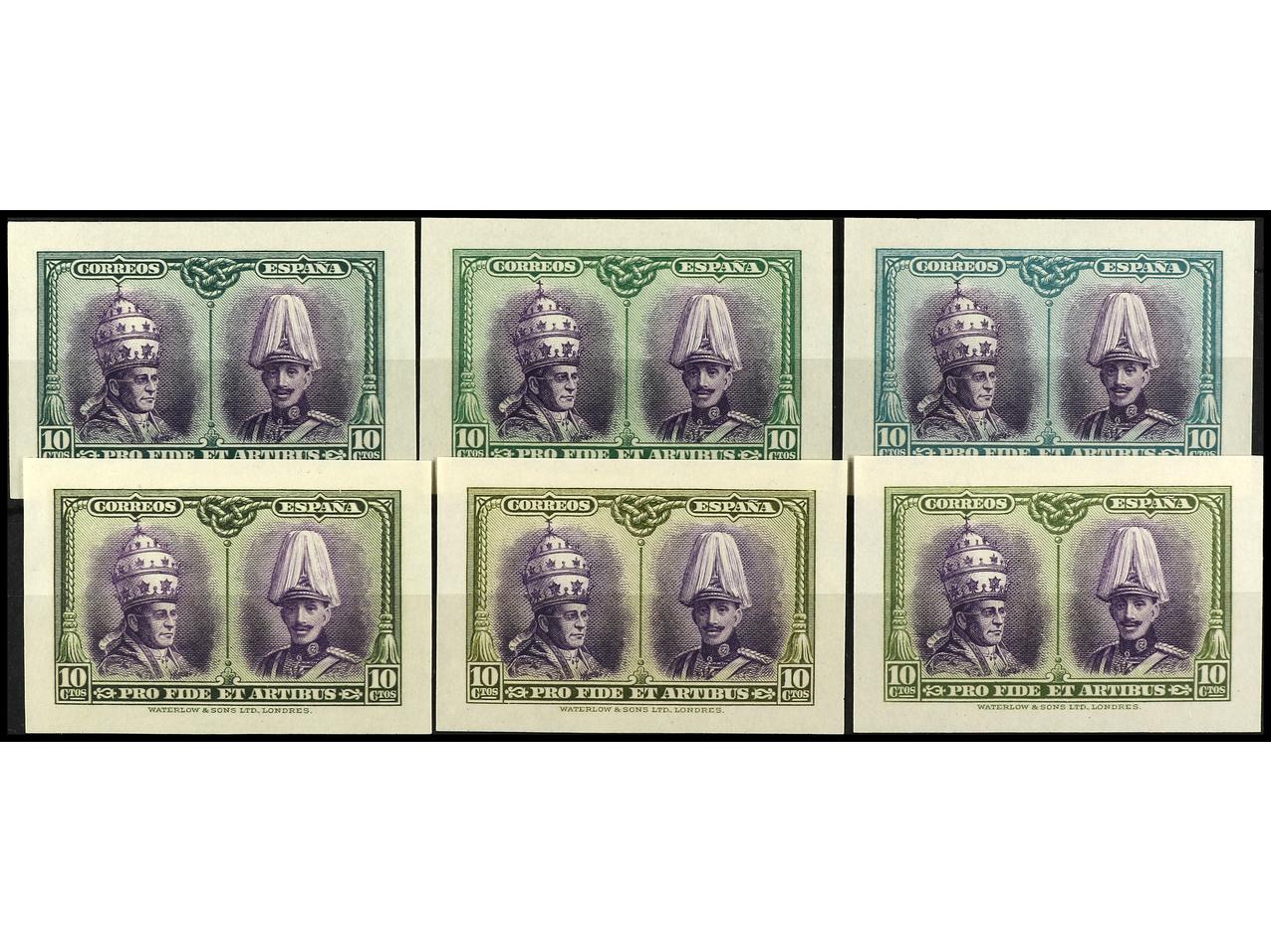 ESPAÑA. CATACUMBAS. ENSAYOS DE COLOR. Conjunto de 24 ensayos del sello de 10 cts. con los centros violeta y los marcos en todas las tonalidades de color conocidas (solo falta una del rosa). MUY RARO. (Gálvez 2290/2300). (Image1) (Image2)