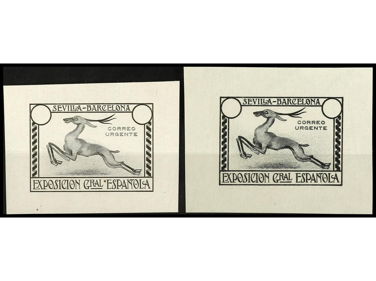 ESPAÑA. EXPO. SEVILLA y BARCELONA. CORREO URGENTE. PRUEBAS DE PUNZÓN. 2 pruebas en color negro y gris sin el valor y sin el año sobre papel estucado. (Gálvez 2382). (Image1) (Image2)