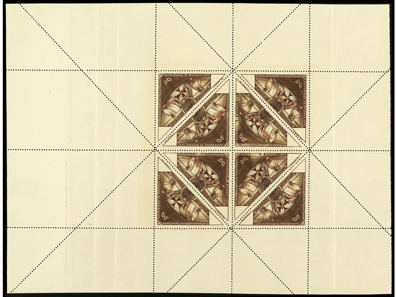 ESPAÑA. COLÓN. Plancha de ocho sellos triangulares para ensayar el acoplamiento de los triángulos con vista a la confección de la plancha definitiva que constaría de 50 ejemplares. Habilitados WATERLOW AND SONS LTD./SPECIMEN. (Gálvez 2683