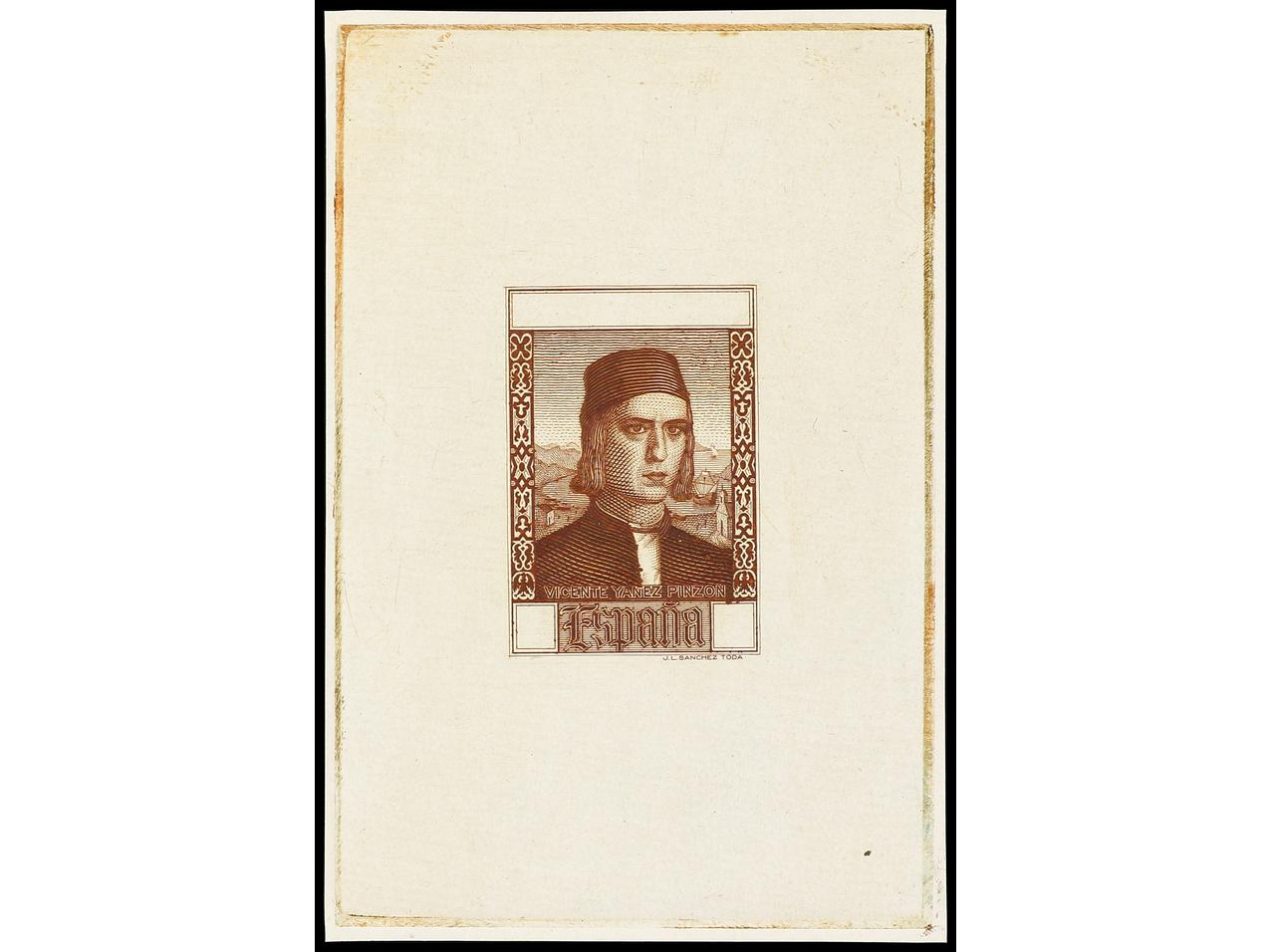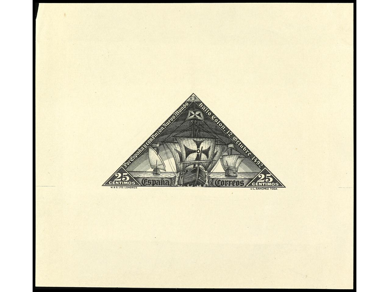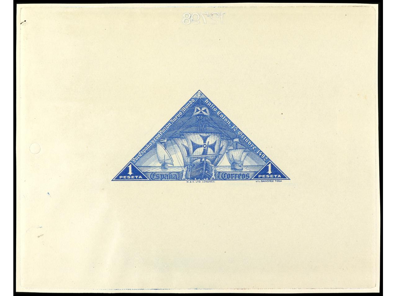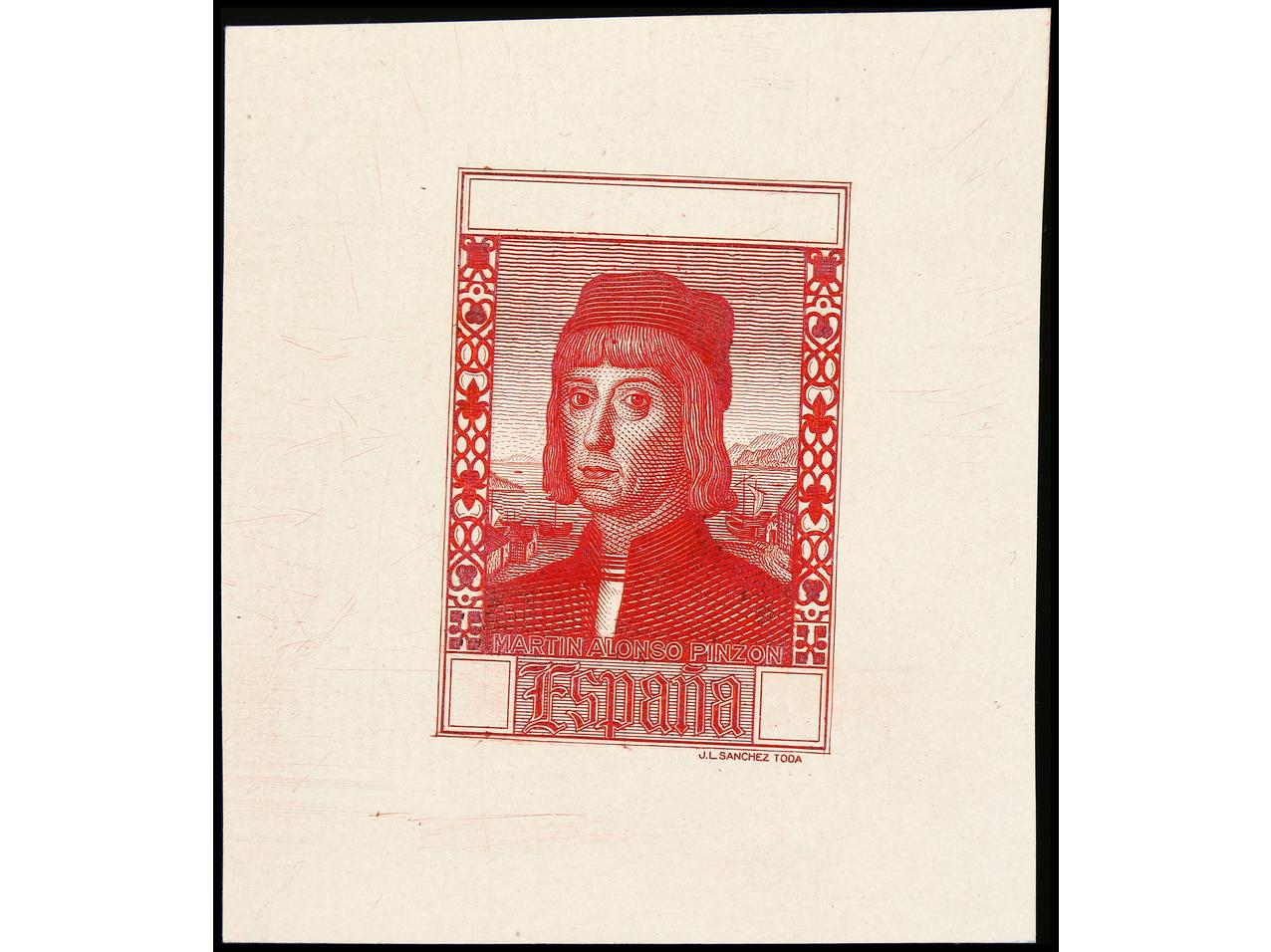 ESPAÑA. COLÓN. CORREO AÉREO. PRUEBA DE PUNZÓN. Grabado sin terminar en color carmín sobre papel estucado. RARA. (Gálvez CA 278). (Image1)