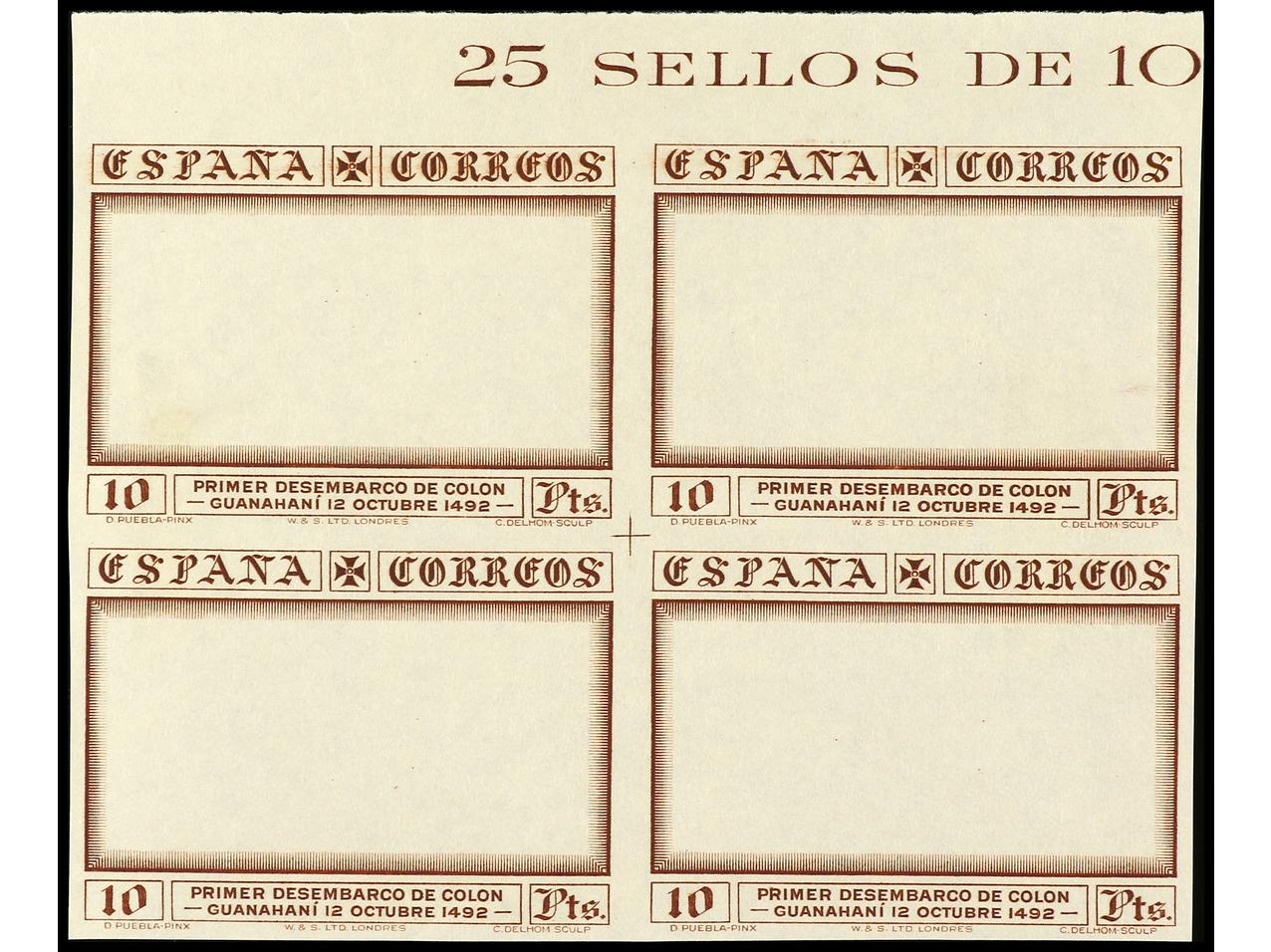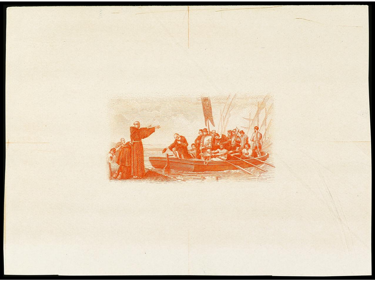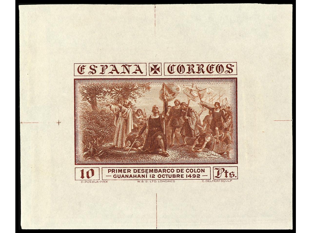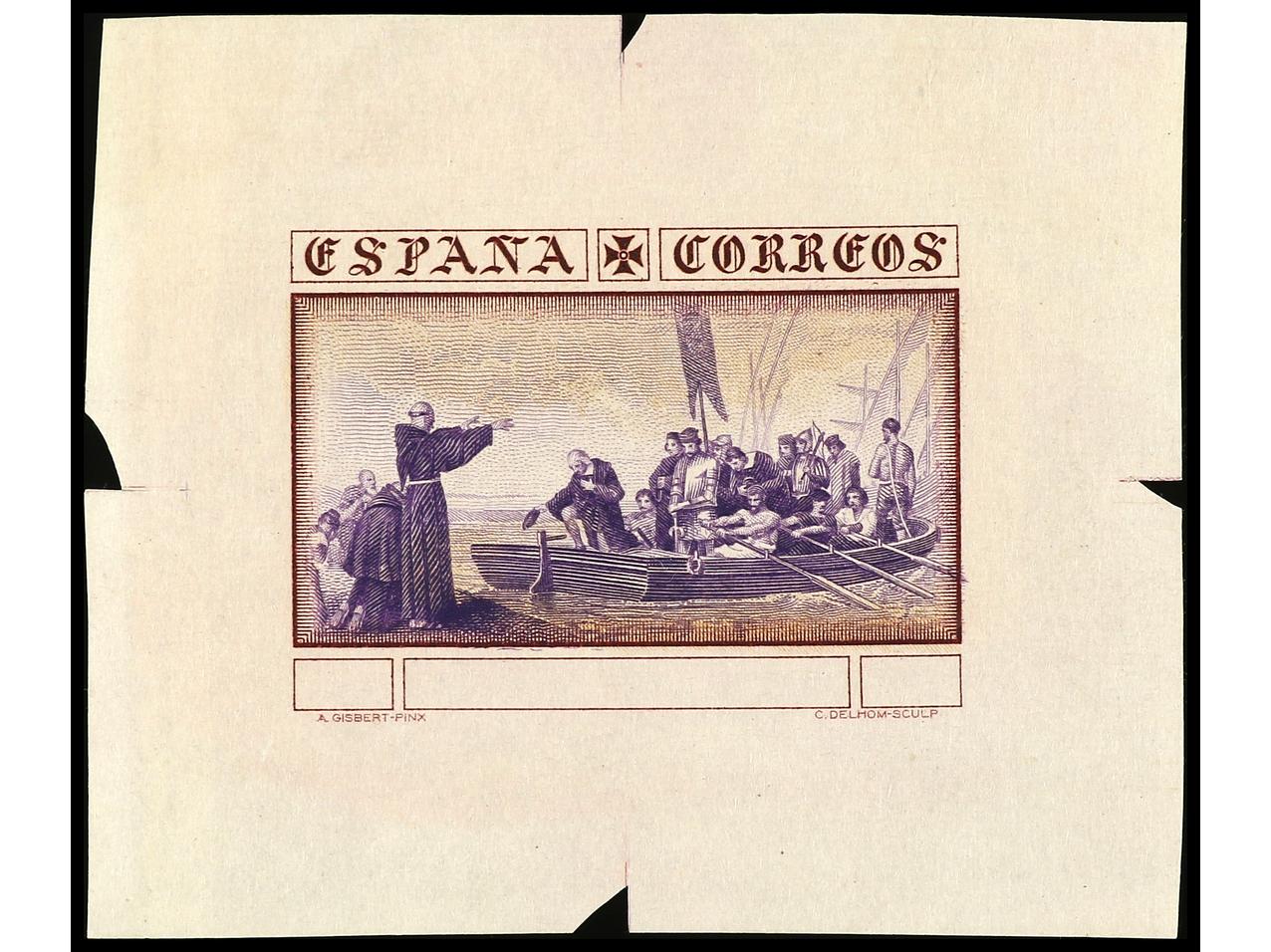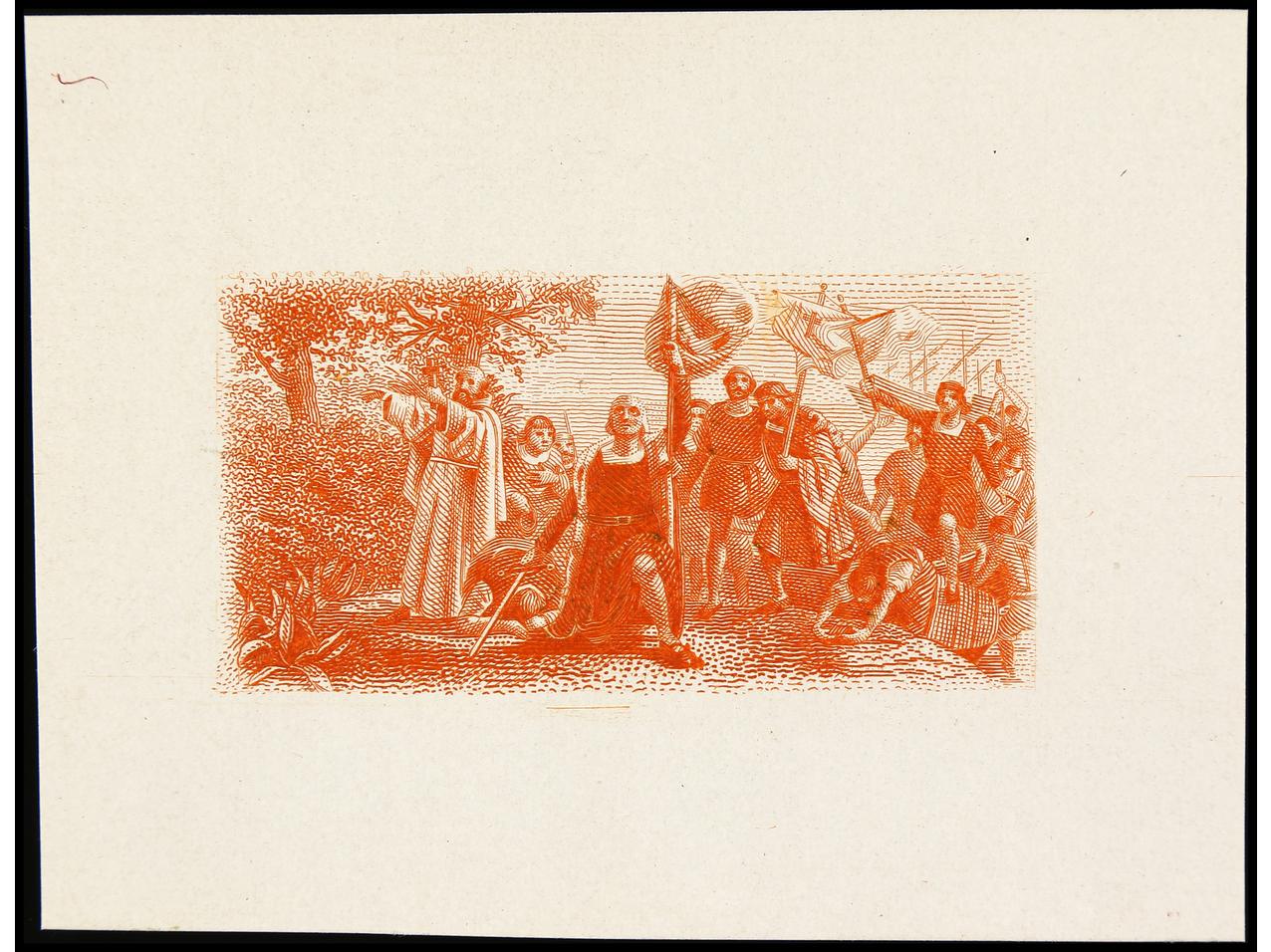 ESPAÑA. COLÓN. PRUEBA DE PUNZÓN. Centro (Desembarco) en color naranja. Grabado completo sobre papel estucado. RARA. (Gálvez 2665). (Image1)