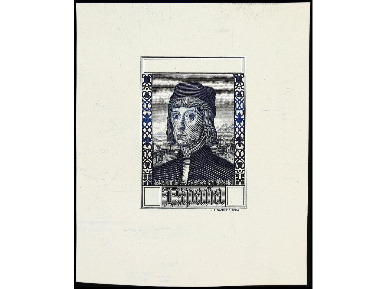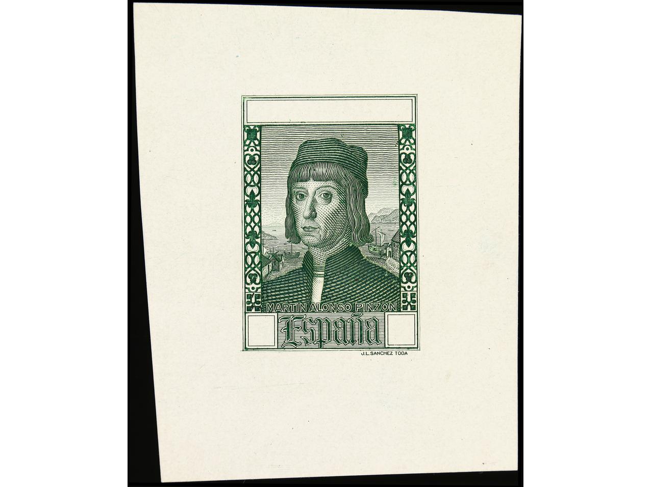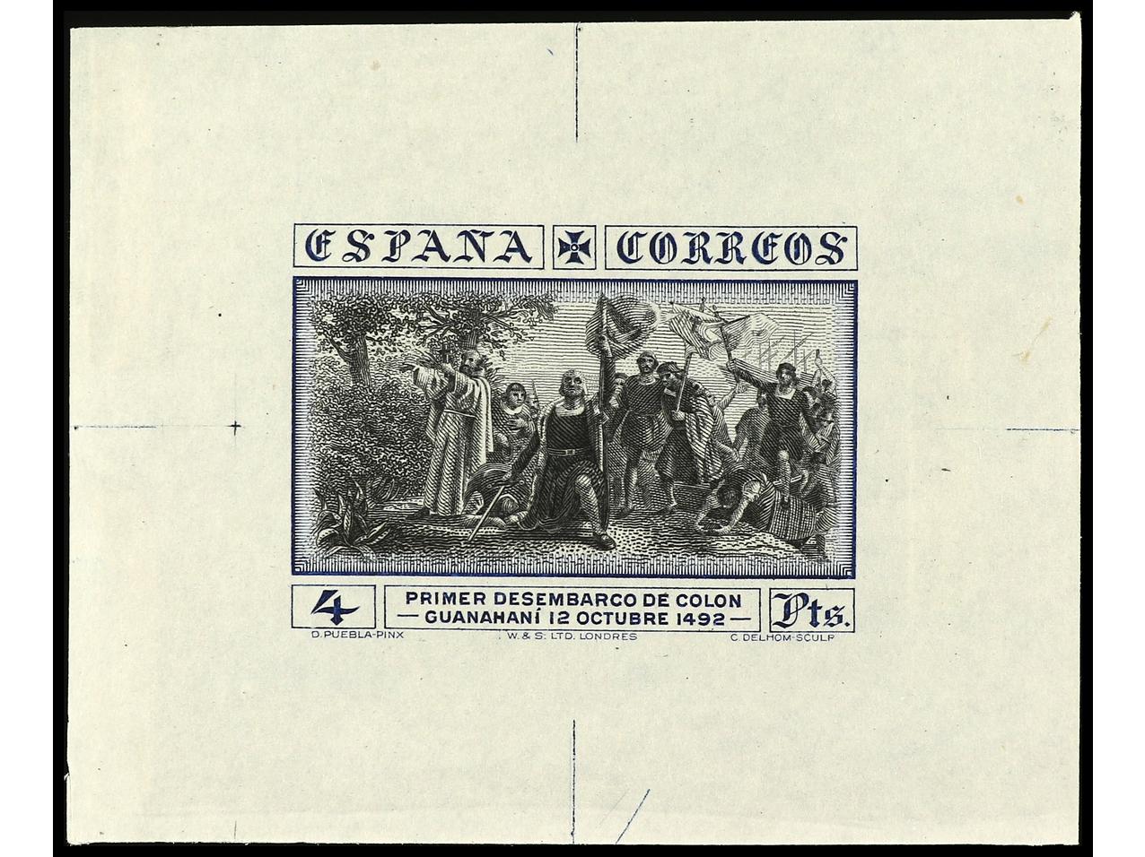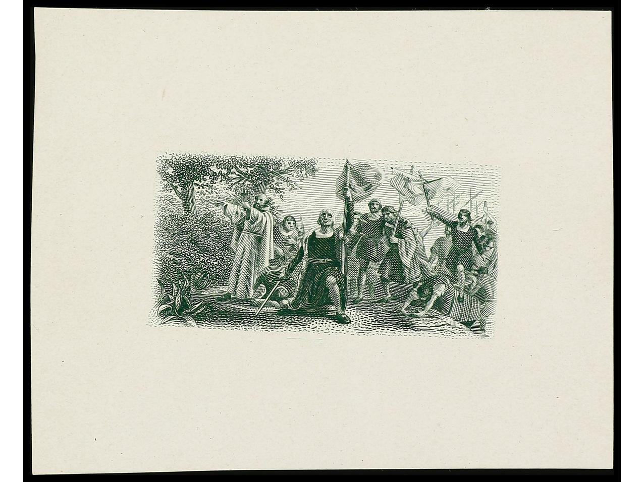 ESPAÑA. COLÓN. PRUEBA DE PUNZÓN. Centro (Desembarco) en color verde, grabado completo sobre papel estucado. RARA. (Gálvez 2663). (Image1)
