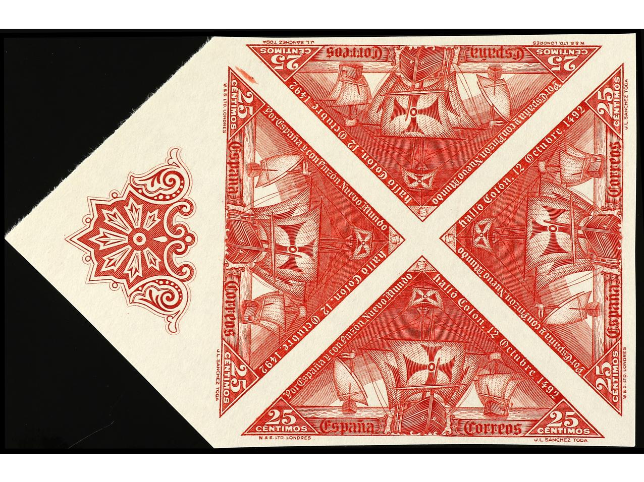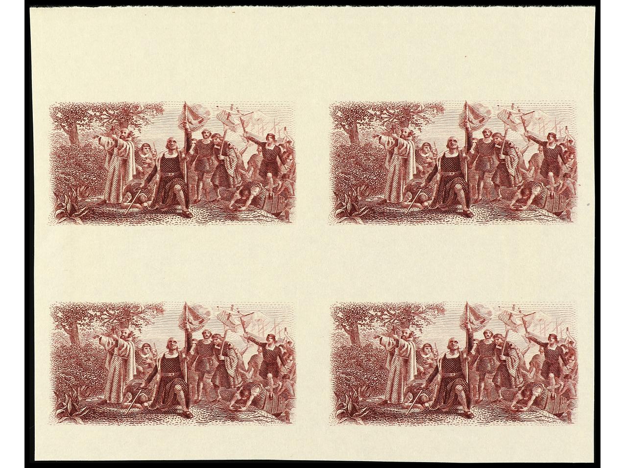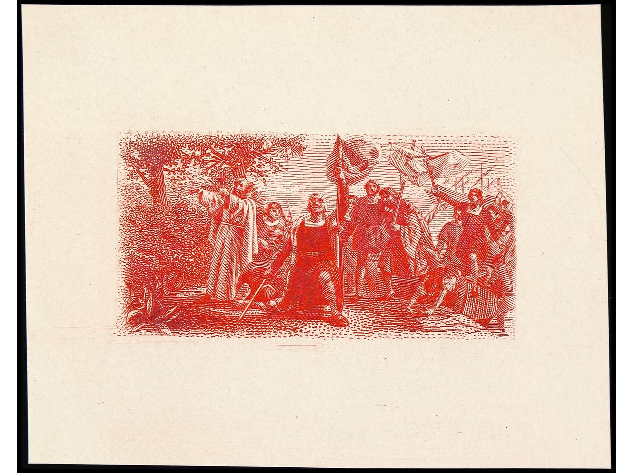 ESPAÑA. COLÓN. PRUEBA DE PUNZÓN. Centro (Desembarco) en color carmín, garbado completo sobre papel estucado. RARA. (Gálvez 2664). (Image1)