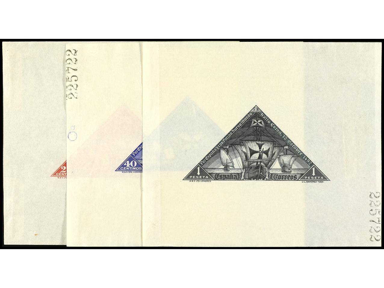 ESPAÑA. COLÓN. PRUEBAS DE PUNZÓN. 25 cts. carmín, 40 cts. carmín y 1 pta. negro. (Gálvez 2693/95). (Image1) (Image2)