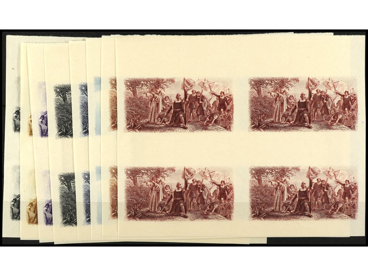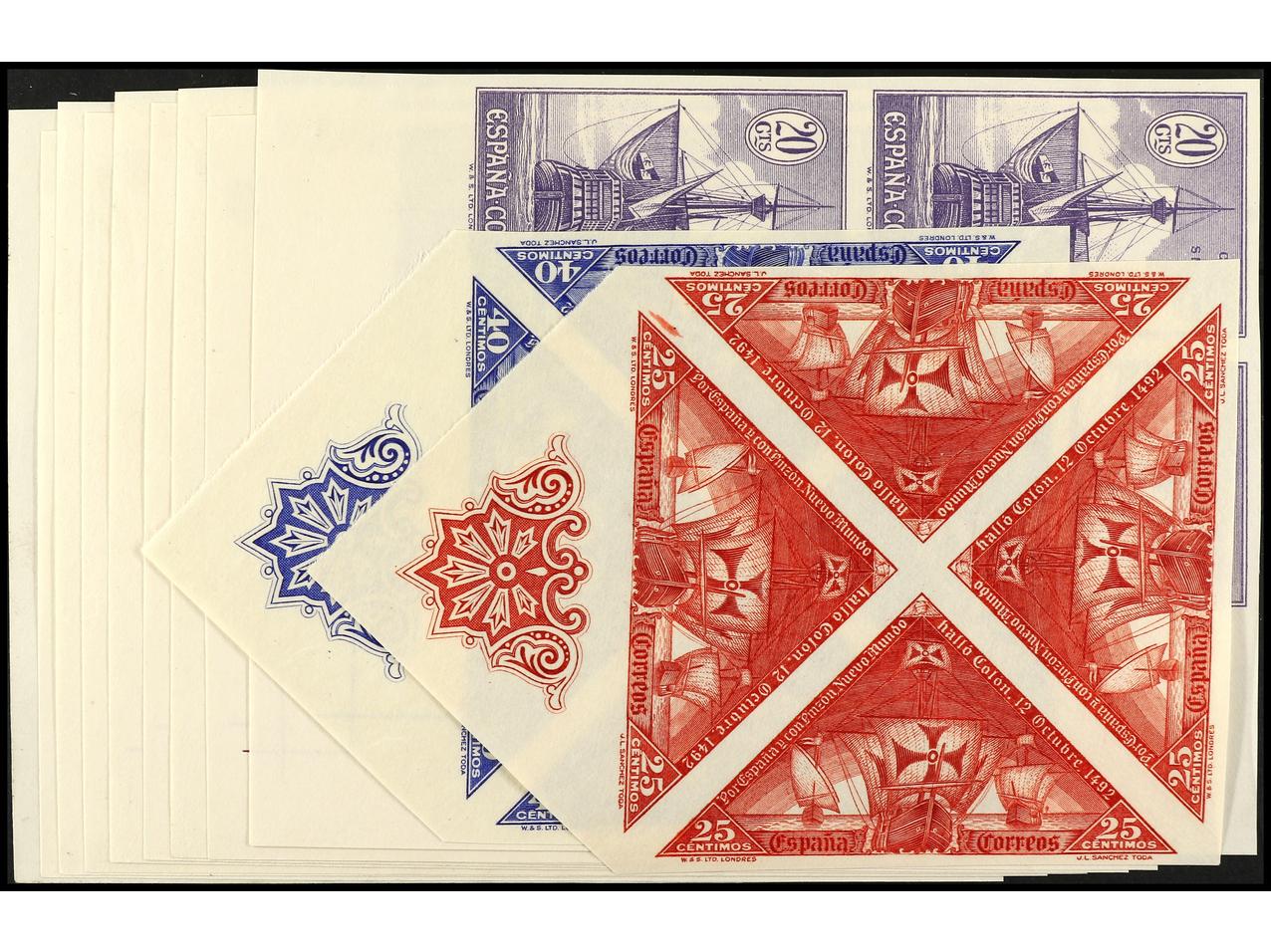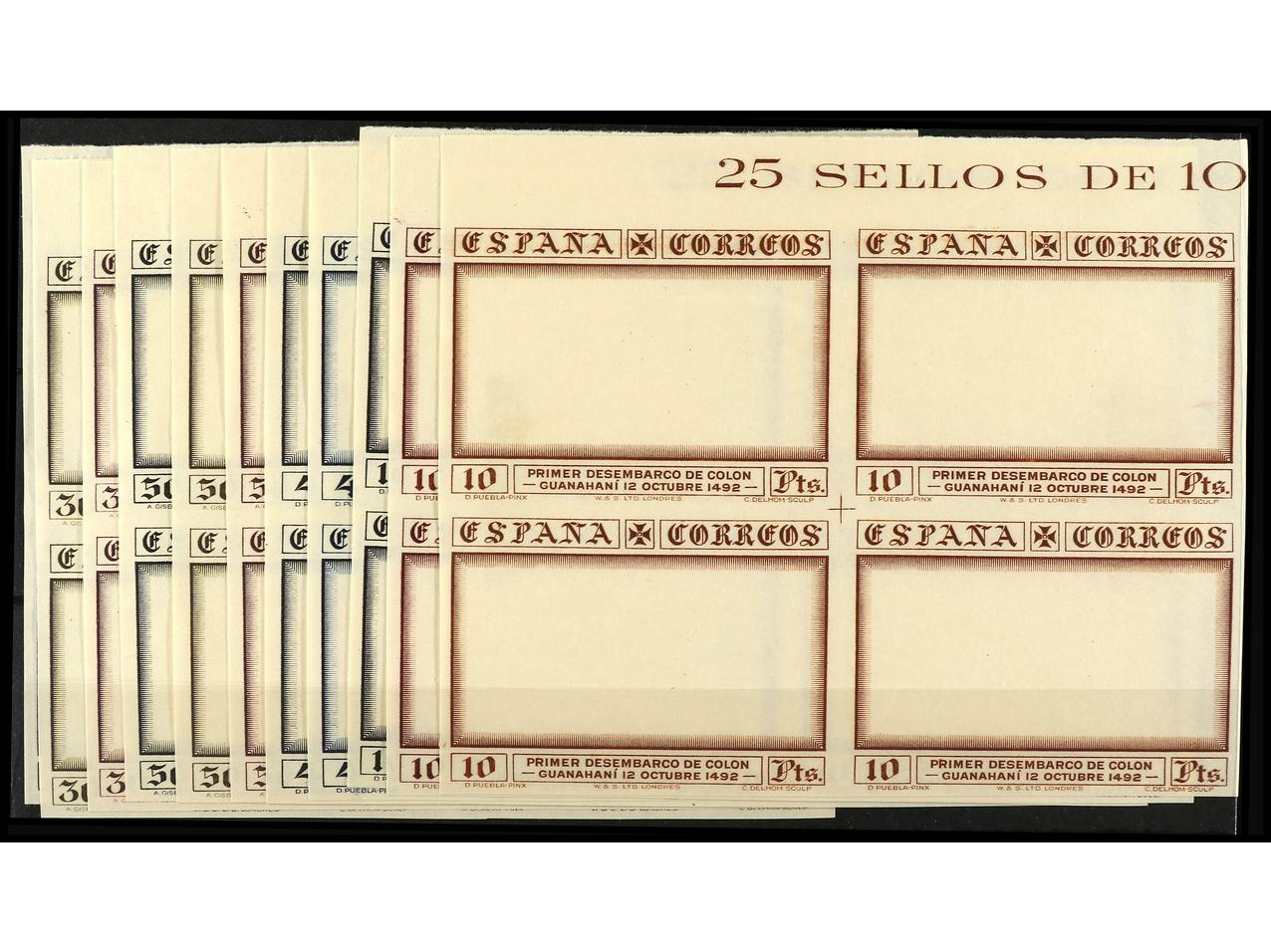 ESPAÑA. COLÓN. ENSAYOS DE PLANCHA. Conjunto de 10 valores del 1 cto. al 25 cts. sin dentar en los colores adoptados, sin goma. (Image1) (Image2)