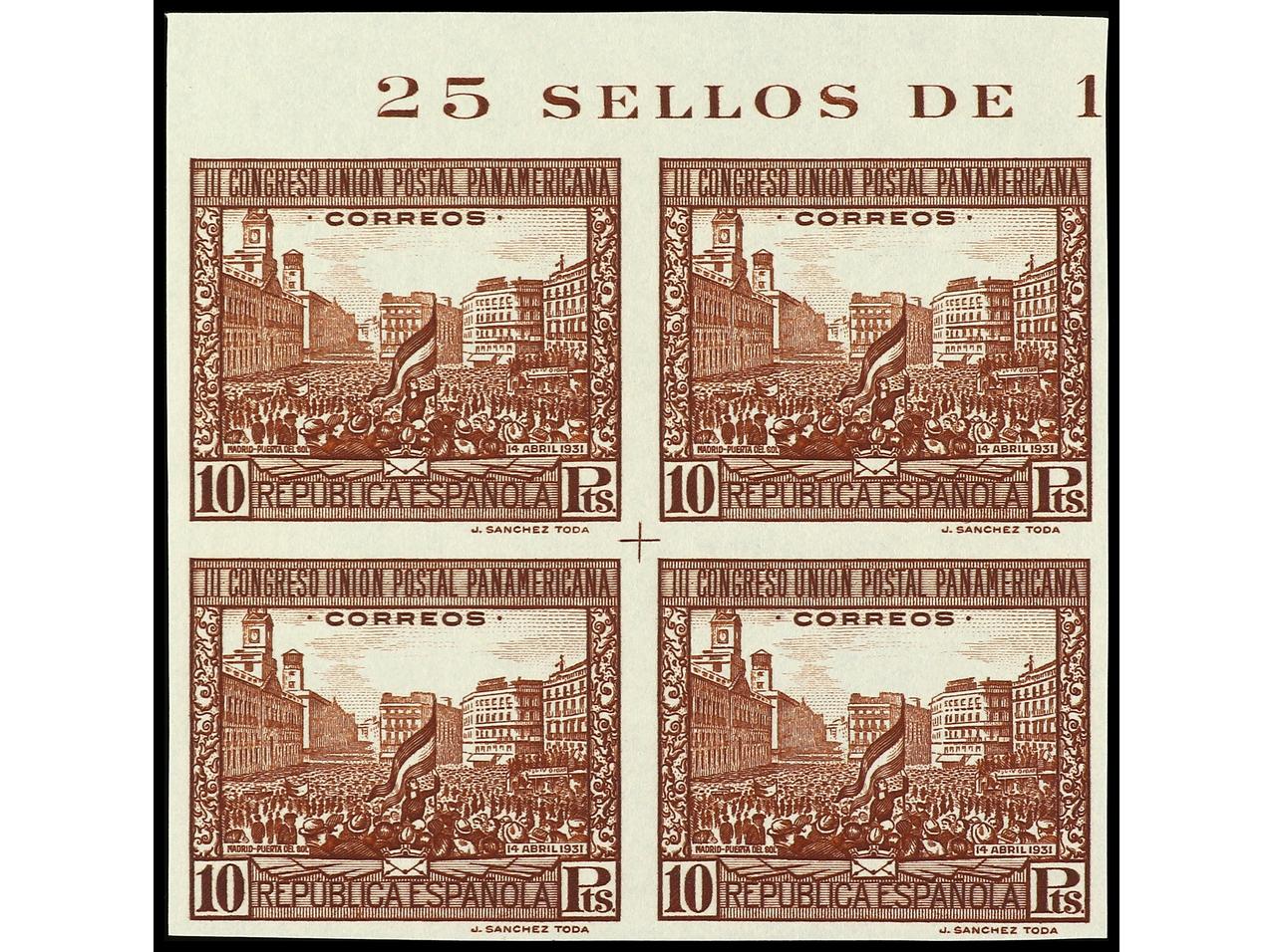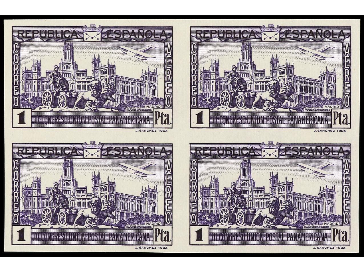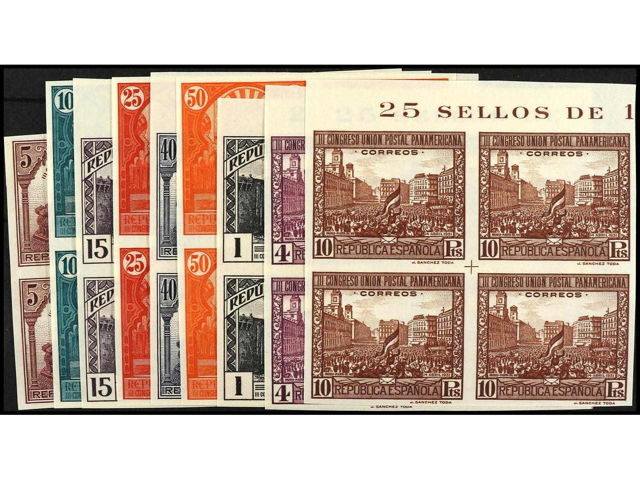 ESPAÑA. UNIÓN POSTAL PANAMERICANA. ENSAYOS DE PLANCHA. Serie completa sin el 30 cts. en los colores adoptados en bloques de cuatro sin goma.