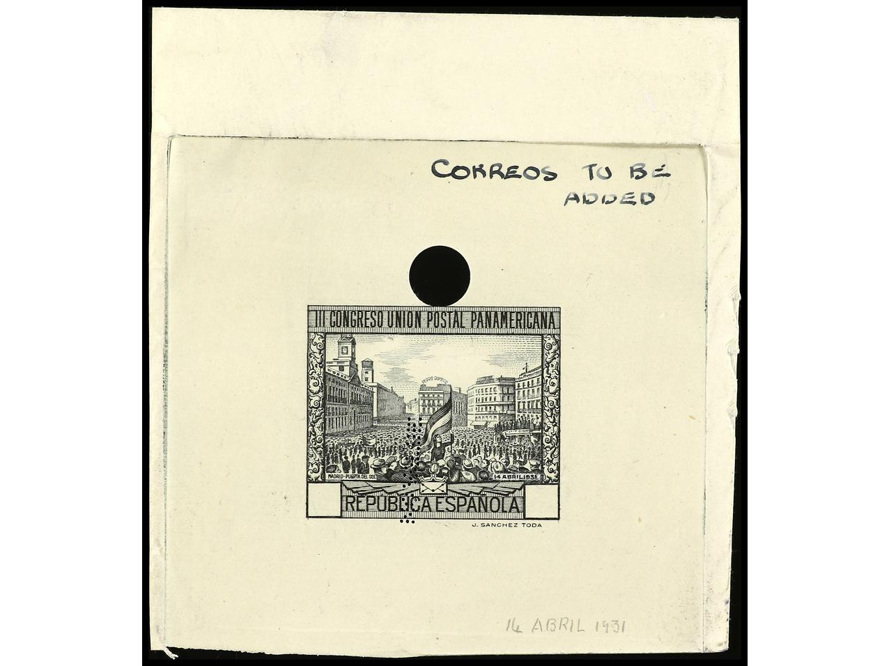 ESPAÑA. UNIÓN POSTAL PANAMERICANA, CORREO AÉREO. PRUEBA DE PUNZÓN. Grabado sin terminar en color negro sobre papel ordinario. RARA. (Gálvez CA 431).