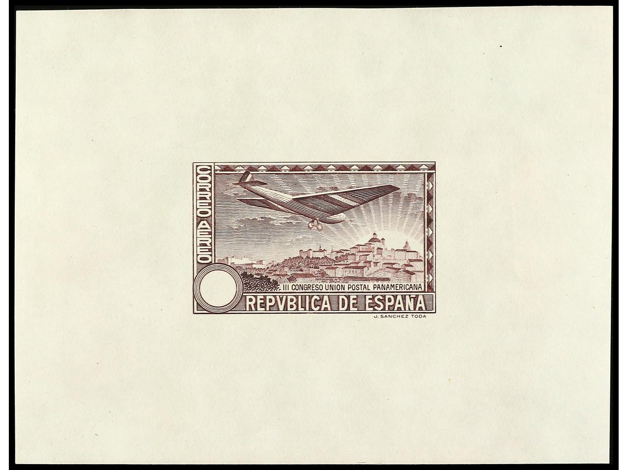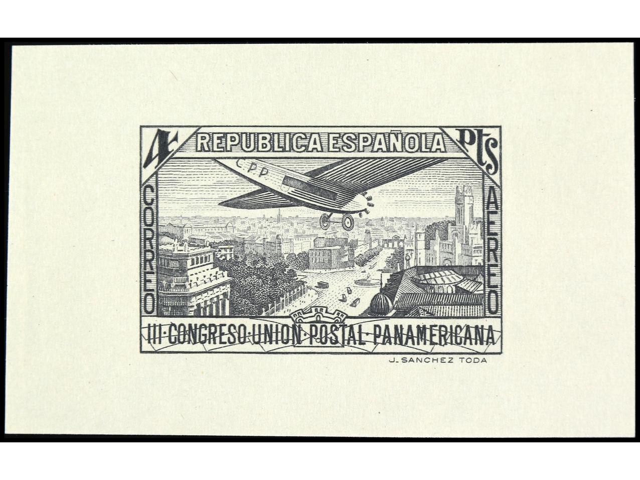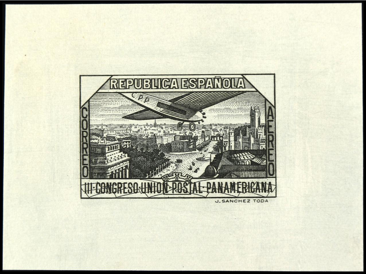 ESPAÑA. UNIÓN POSTAL PANAMERICANA. CORREO AÉREO. PRUEBA DE PUNZÓN grabado sin terminar en color castaño negro, sobre papel ordinario. (Gálvez CA 423).