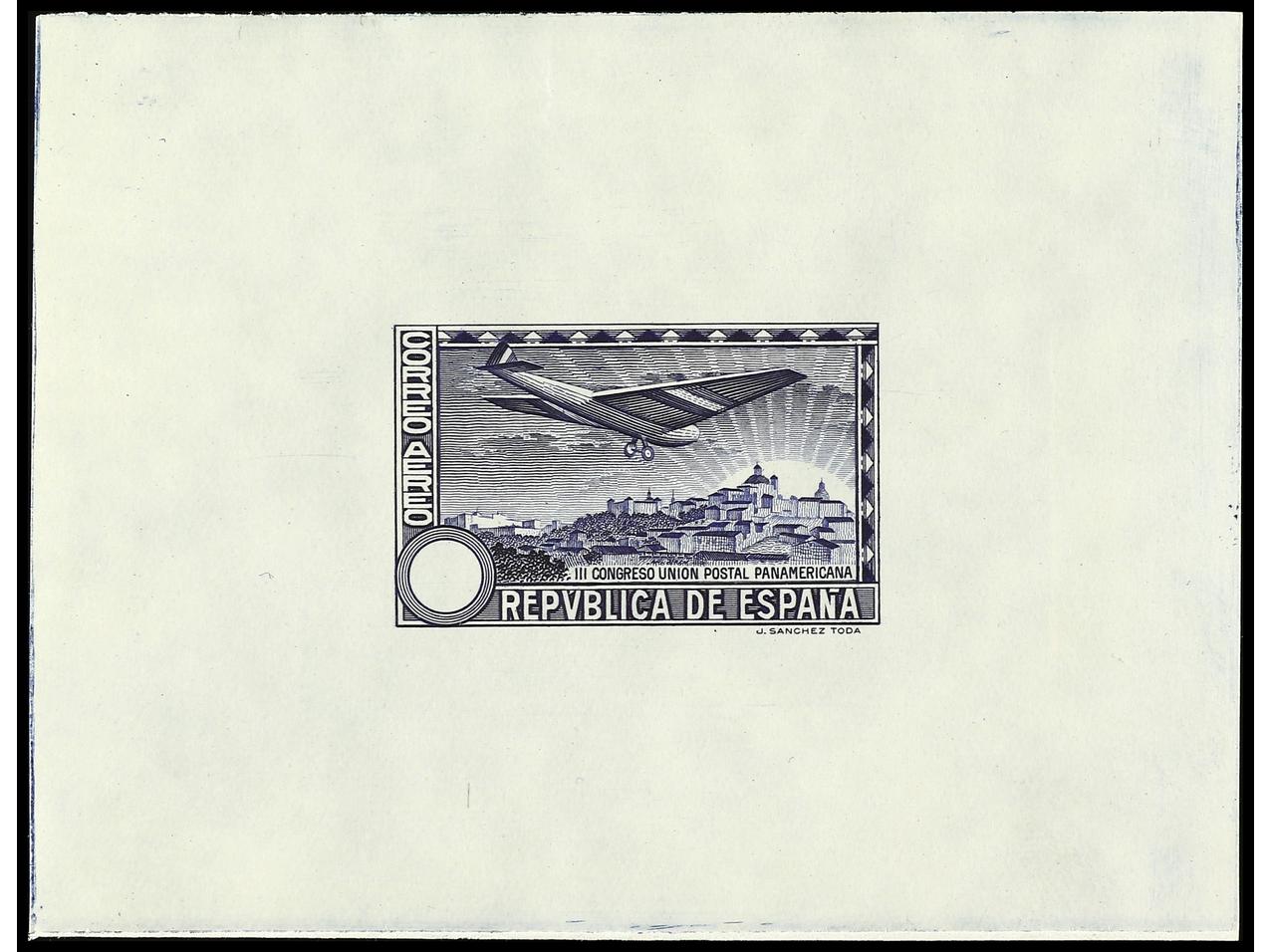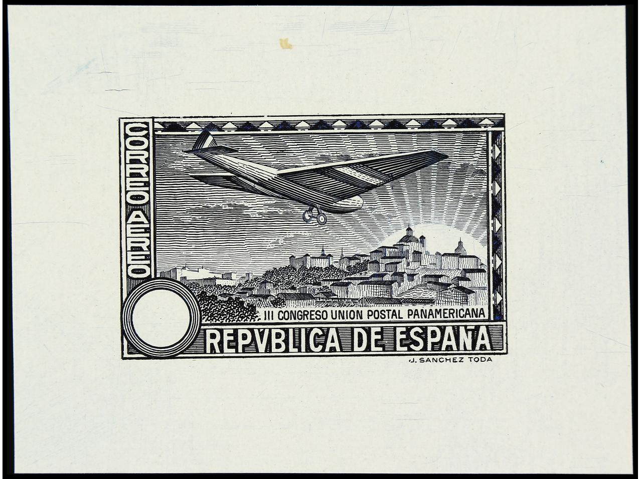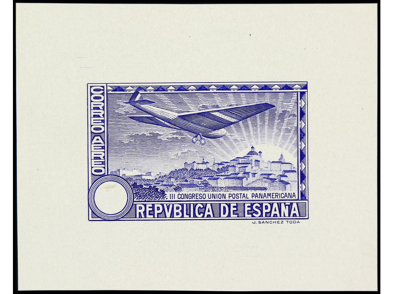 ESPAÑA. UNIÓN POSTAL PANAMERICANA. CORREO AÉREO. PRUEBA DE PUNZÓN grabado sin terminar en color azul ultramar sobre papel estucado. No reseñada. RARA.