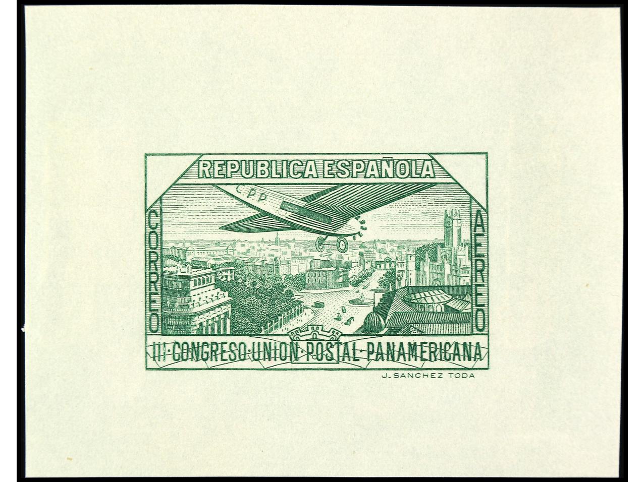 ESPAÑA. UNIÓN POSTAL PANAMERICANA, CORREO AÉREO. PRUEBA DE PUNZÓN grabado sin terminar en color verde sobre papel ordinario. RARA. (Gálvez CA 433).