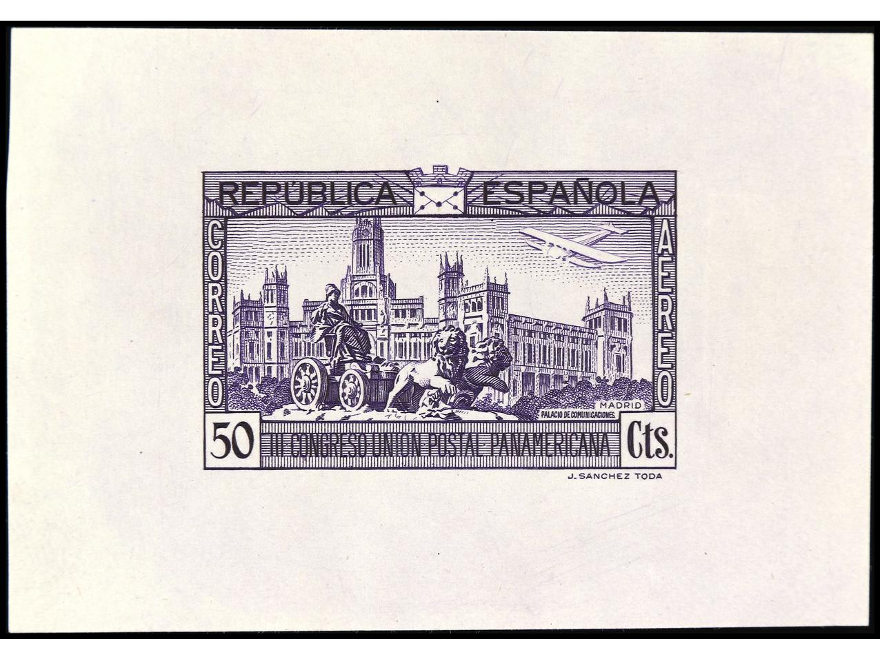 ESPAÑA. UNIÓN POSTAL PANAMERICANA. CORREO AÉREO. PRUEBA DE PUNZÓN grabado sin terminar en color castaño violeta sobre papel ordinario. RARA. (Gálvez CA 424).