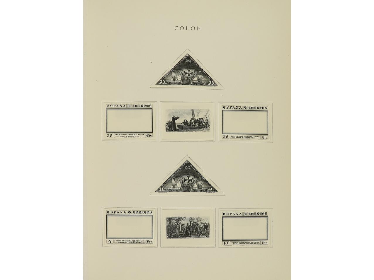 ESPAÑA. ENSAYOS DE COLOR. Colección de ensayos de las emisiones de CATACUMBAS, GOYA, COLÓN, IBEROAMERICANA, UNIÓN POSTAL, PANAMERICANA con sellos sin dentar, ensayos en negro, centros y marcos en diversos colores, montado en un álbum de