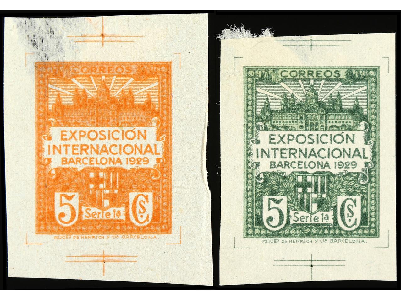 ESPAÑA: AYUNTAMIENTO DE BARCELONA. PRUEBAS DE LOS REPORTES ORIGINALES. 5 cts. naranja y 5 cts. verde y verde claro adelgazadas. (Gálvez B2, B8).