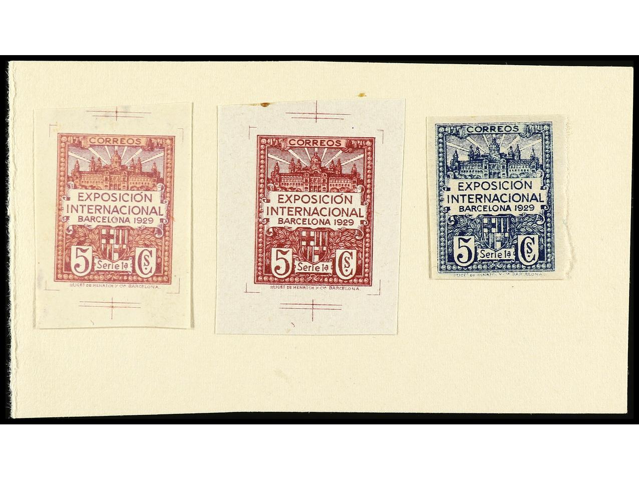 ESPAÑA: AYUNTAMIENTO DE BARCELONA. PRUEBAS DE LOS REPORTES ORIGINALES. Serie 1ª. 5 cts. azul y azul claro, 5 cts. carmín y 5 cts. rosa (dos tonos de color) márgenes pequeños sobre hoja de presentación. (Gálvez B3, B4). (Image1)