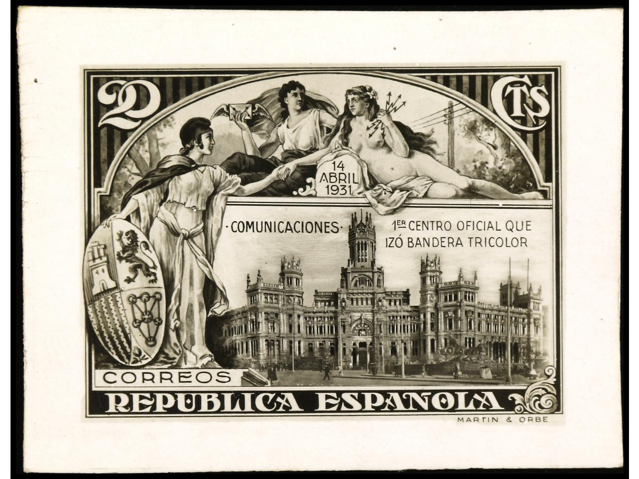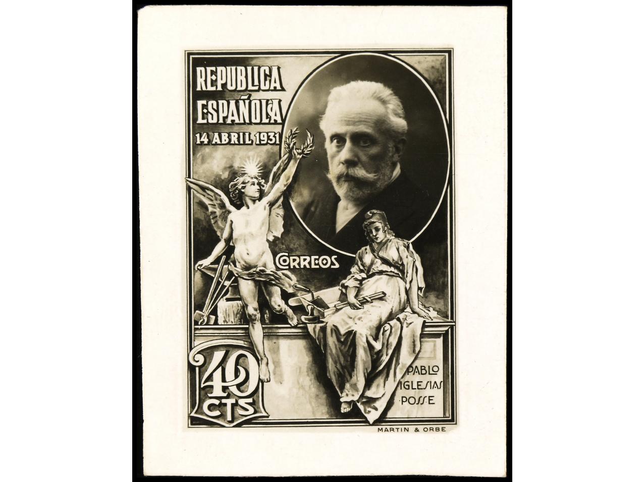 ESPAÑA. REPÚBLICA. PRUEBA FOTOGRÁFICA ORIGINAL. 40 cts. PABLO IGLESIAS y ALEGORIA PROCLAMACIÓN DE LA REPÚBLICA. Diseño no adoptado. (Image1)