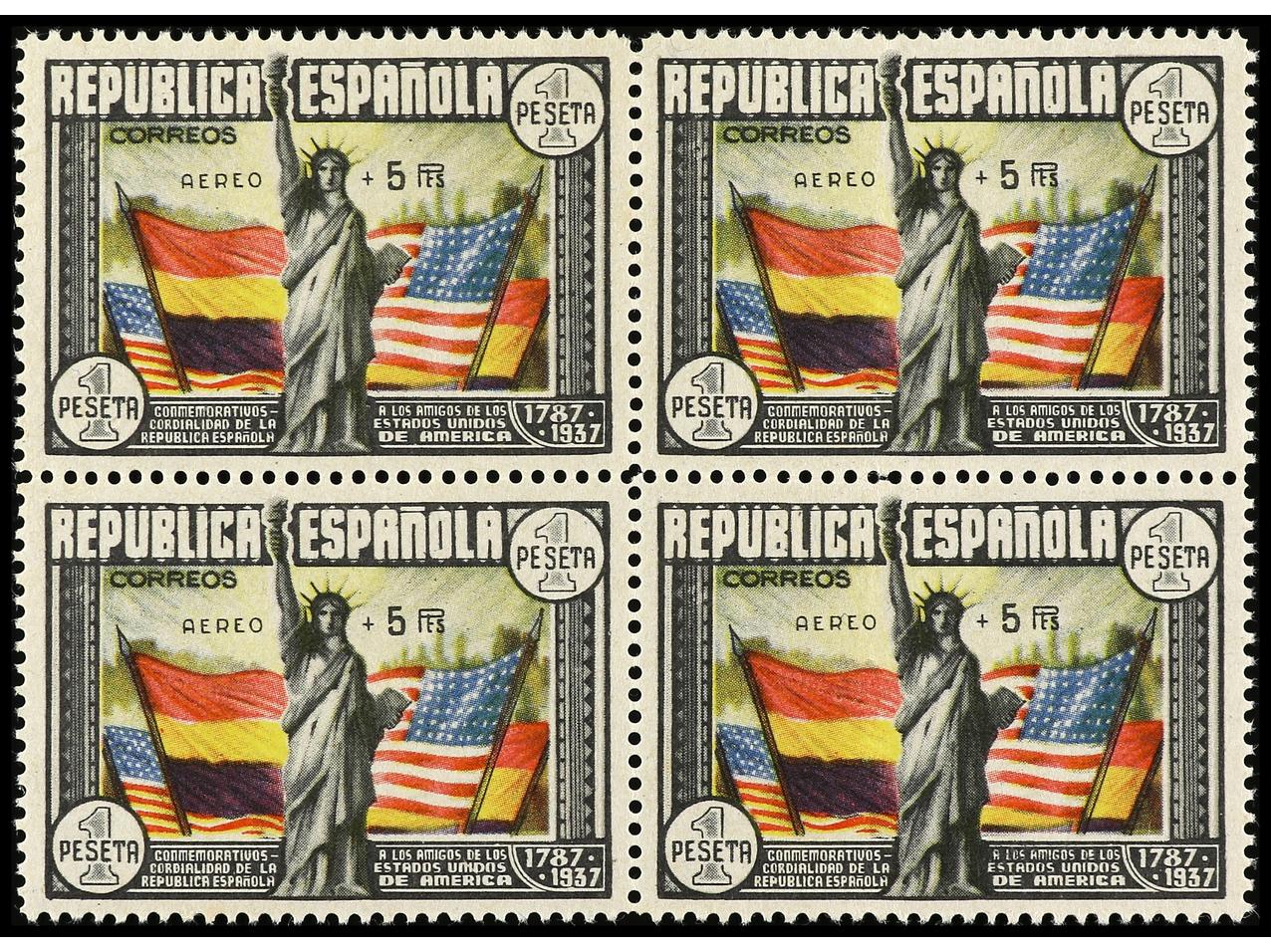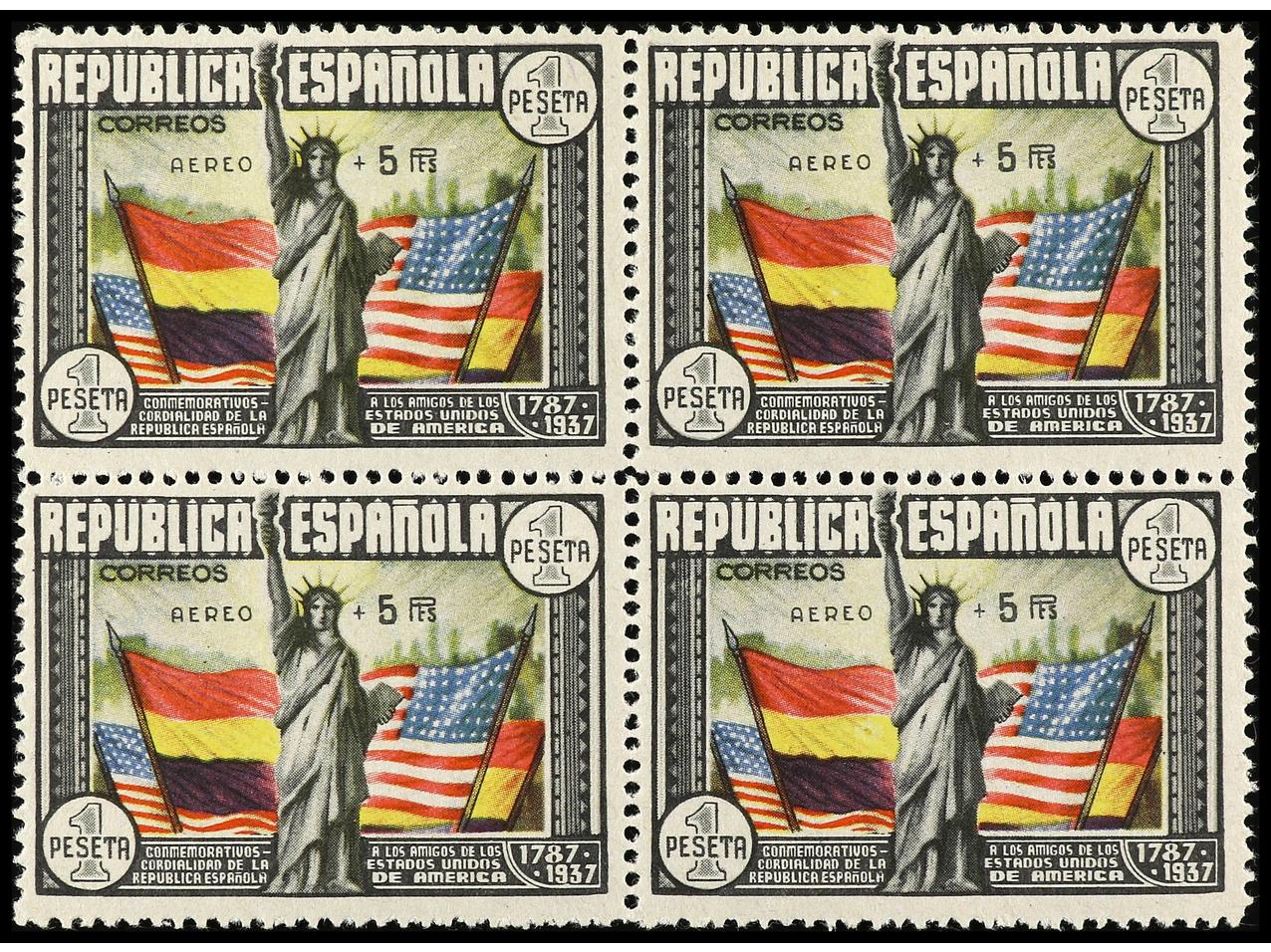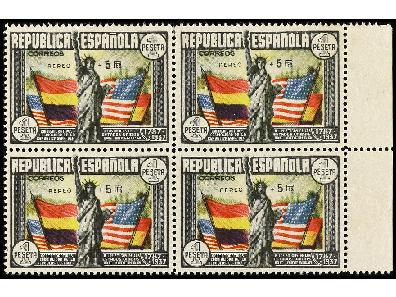 ESPAÑA. Aéreo + 5 pts. multicolor. Bloque de cuatro. Sellos superiores con fijasellos (uno punto tonalizado). Sellos inferiores sin fijasellos, uno con pequeña inclusión. Centrado. Ed.765. Cat. 1.700€. (Image1)