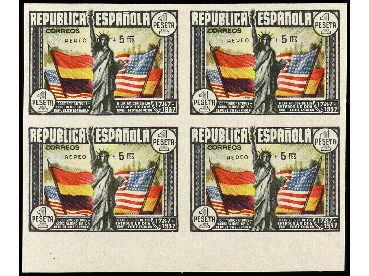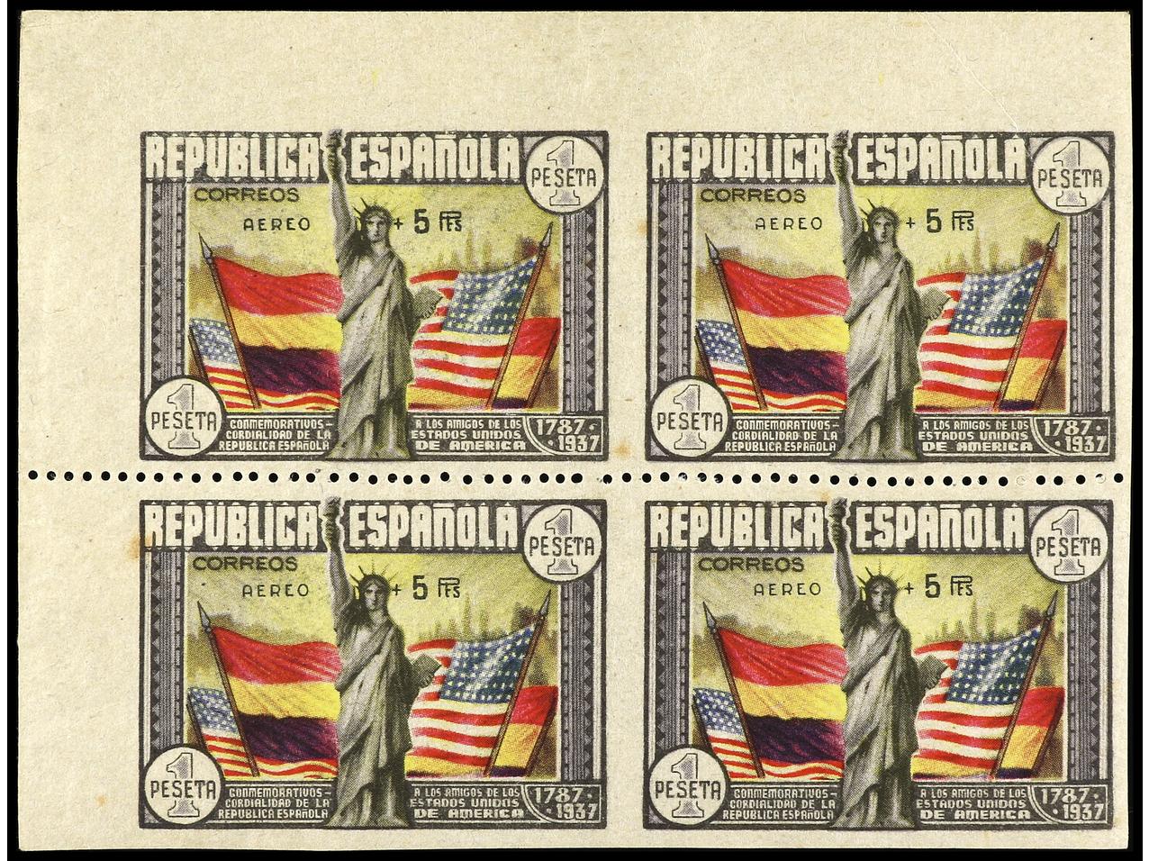 ESPAÑA. Aéreo + 5 pts. multicolor. Bloque de cuatro SIN DENTAR. Un sello, mancha tonalizada. Ed.765s. Cat. 2.800€. (Image1)