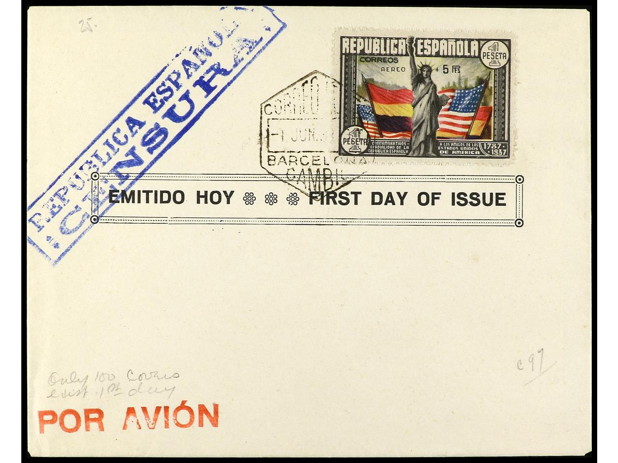 ESPAÑA. 1938. Aéreo + 5 pts. multicolor en sobre con mat. de primer día. Ed.765. (Image1) (Image2)