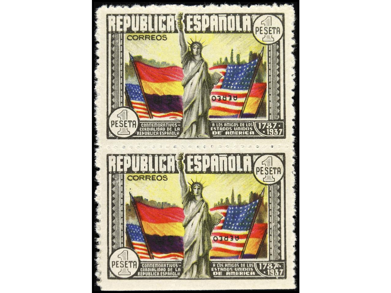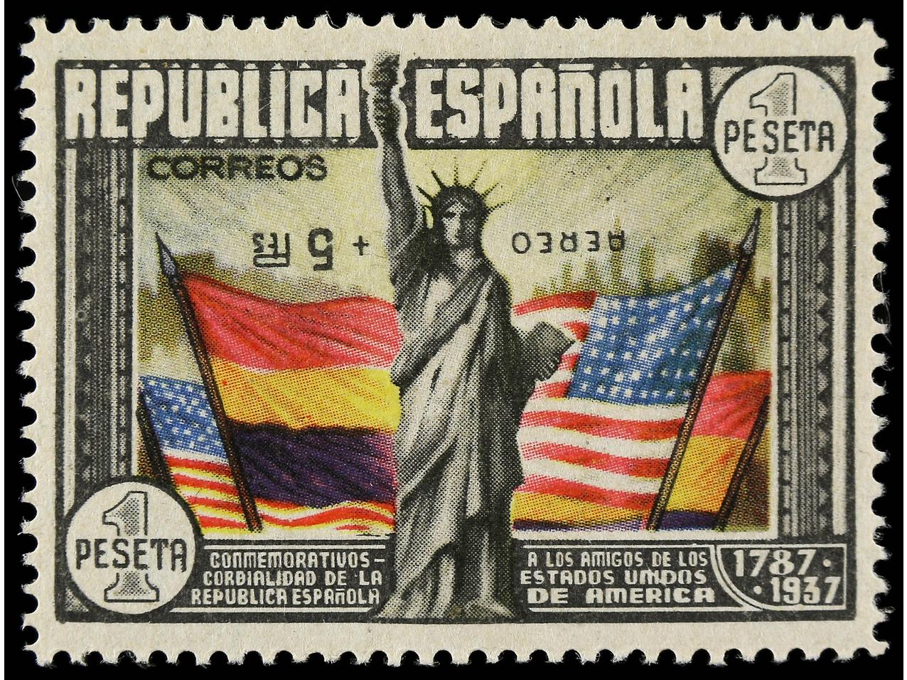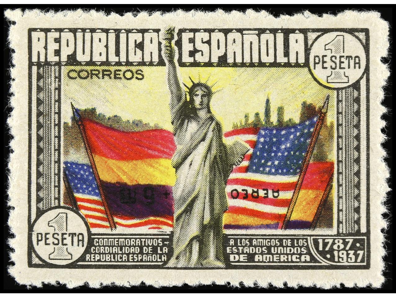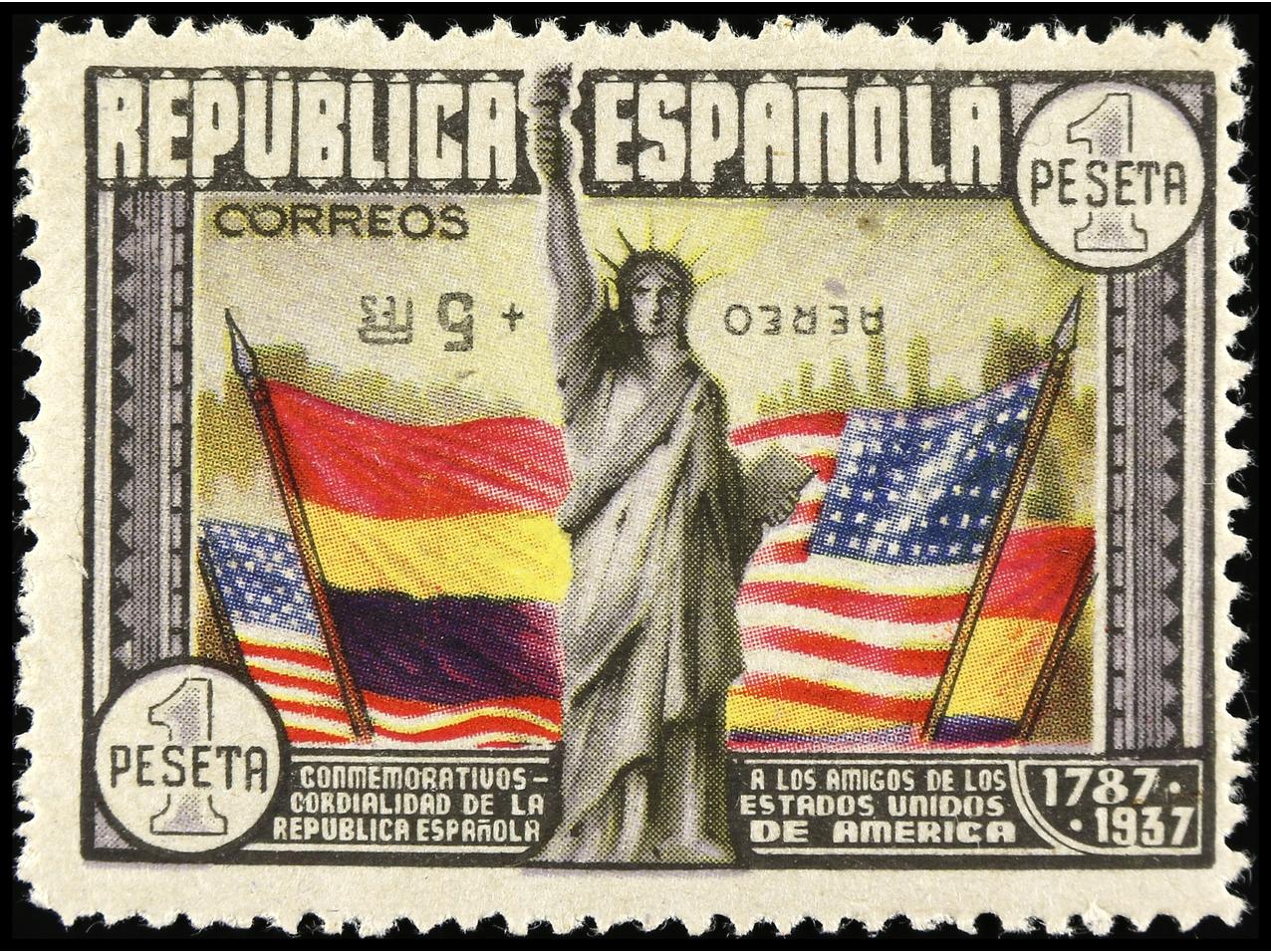 ESPAÑA. Aéreo + 5 pts. multicolor. SOBRECARGA DESPLAZADA e INVERTIDA. Pareja. SIN DENTAR MARGEN INFERIOR. Firmado MONGE. Ed.765hi. (Image1)