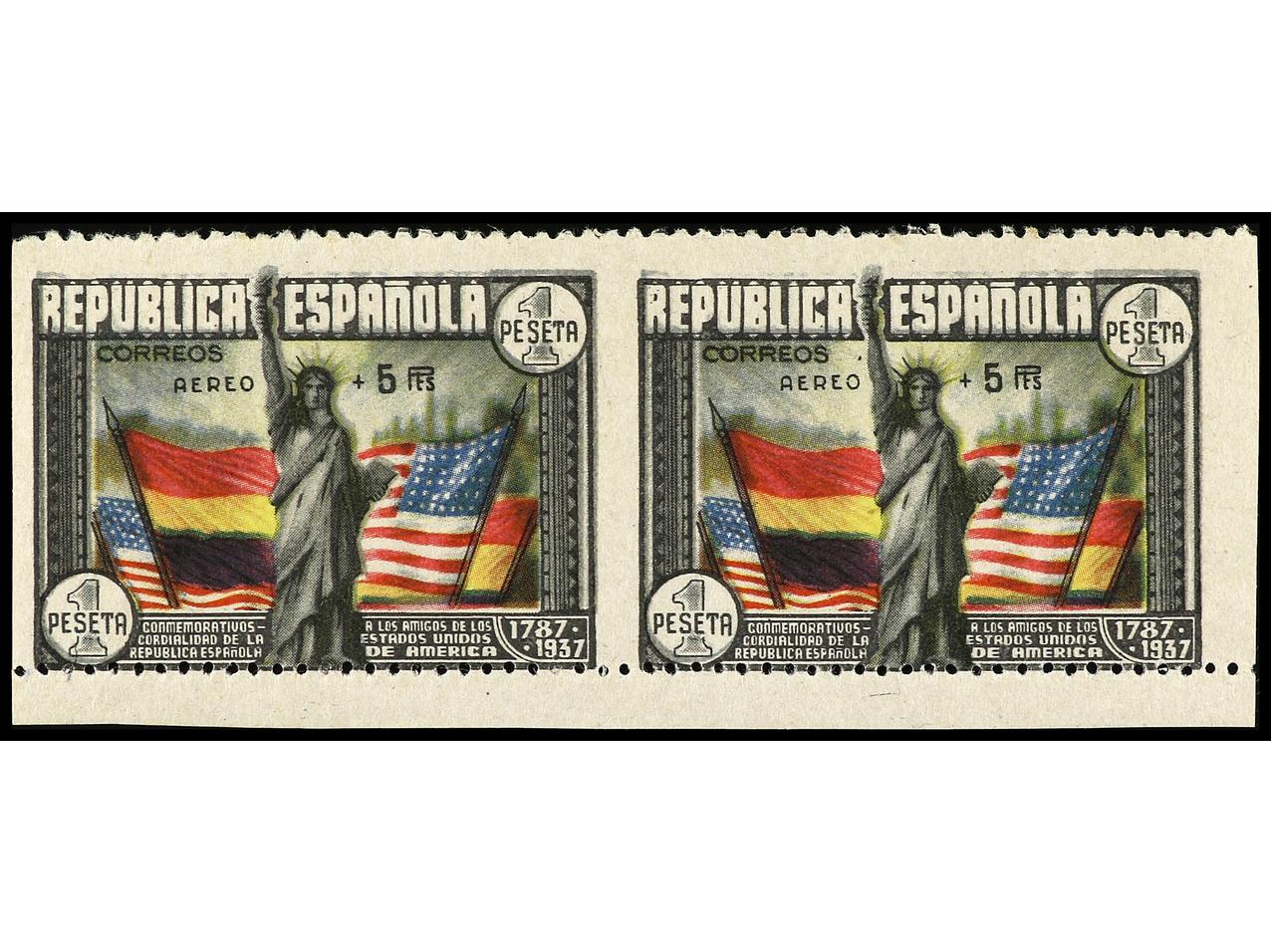 ESPAÑA. Aéreo + 5 pts. multicolor. Pareja horizontal SIN DENTADO VERTICAL, dentado 11 y FONDO GRIS. MUY RARO. Firmado P. MONGE y ROIG. Ed.765adsph.