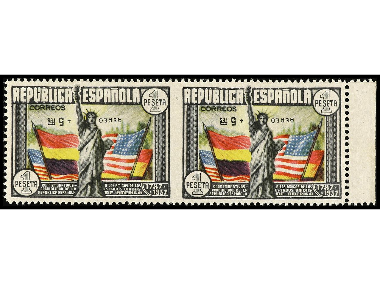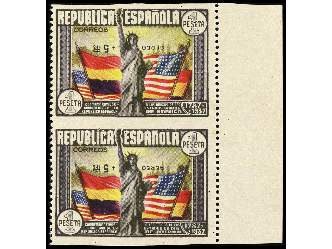 ESPAÑA. Aéreo + 5 pts. multicolor. SOBRECARGA DESPLAZADA HACIA ABAJO E INVERTIDA. Pareja. SIN DENTAR MARGEN INFERIOR. RARO. Firmado MONGE. Ed.765hi.