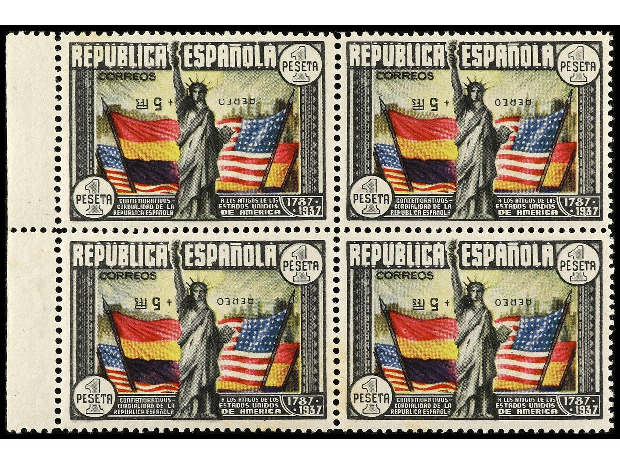 ESPAÑA. Aéreo + 5 pts. multicolor. Bloque de cuatro SOBRECARGA INVERTIDA. Dos valores manchas del tiempo (age stains). Firmado MONGE y ZUAZO. Ed.765hi. Cat. +1.620€. (Image1)