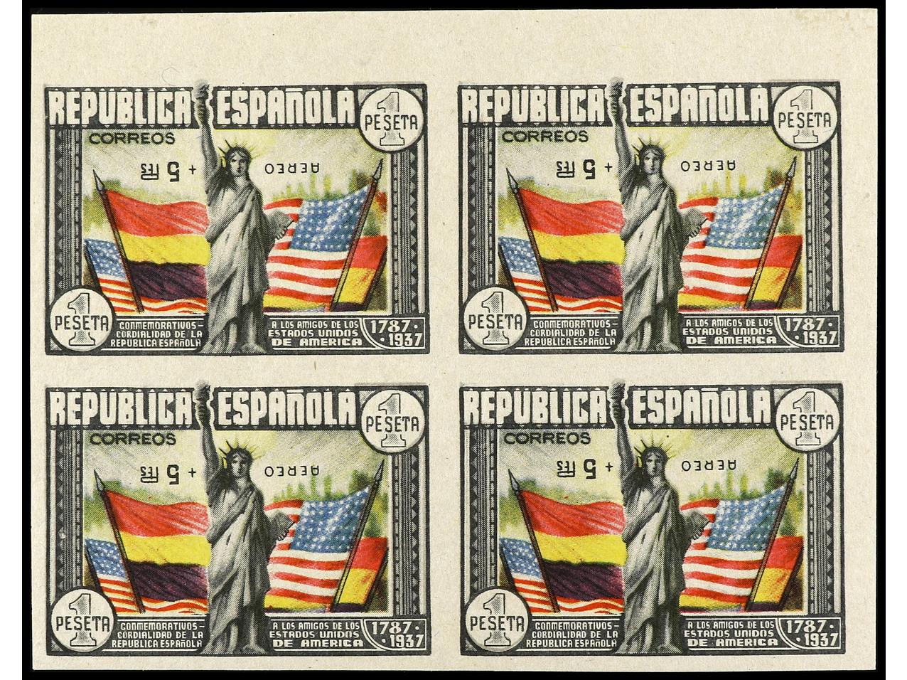 ESPAÑA. Aéreo + 5 pts. multicolor. SIN DENTAR y SOBRECARGA INVERTIDA. Bloque de cuatro. LUJO. Firmado MONGE. Ed.765his. Cat. +2.100€. (Image1)