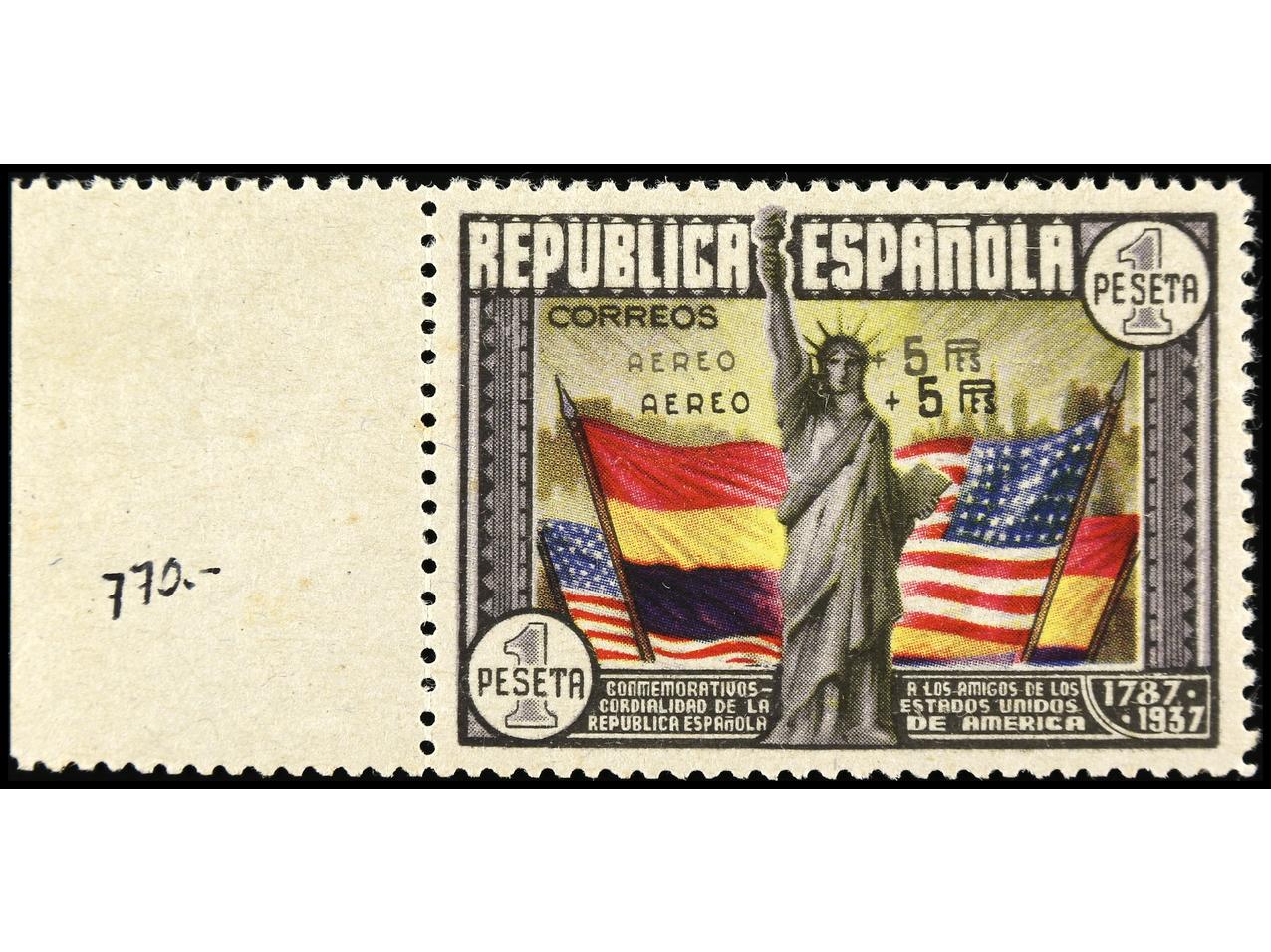 ESPAÑA. Aéreo + 5 pts. multicolor. SOBRECARGA EN CARMÍN. Puntos de tinta de imprenta en anverso. RARO. Firmado GÁLVEZ, ROIG y SANABRIA. Ed.765hcc. Cat. +1.000€.