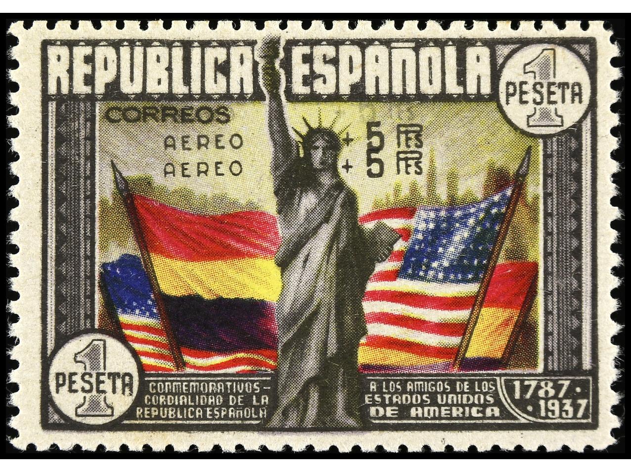 ESPAÑA. Aéreo + 5 pts. multicolor SOBRECARGA DOBLE. Leve inclusión al dorso. LUJO. Firmado ROIG. Ed.765hh. Cat. +525€. (Image1)
