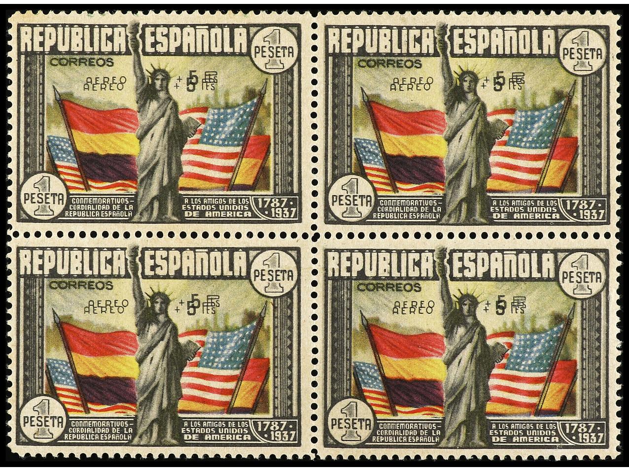 ESPAÑA. Aéreo + 5 pts. multicolor. SOBRECARGA DOBLE. Bloque de cuatro. Un sello, punto claro. Firmado ROIG, HEVIA y otros. RARO. Ed.765hh. Cat. +2.100€.
