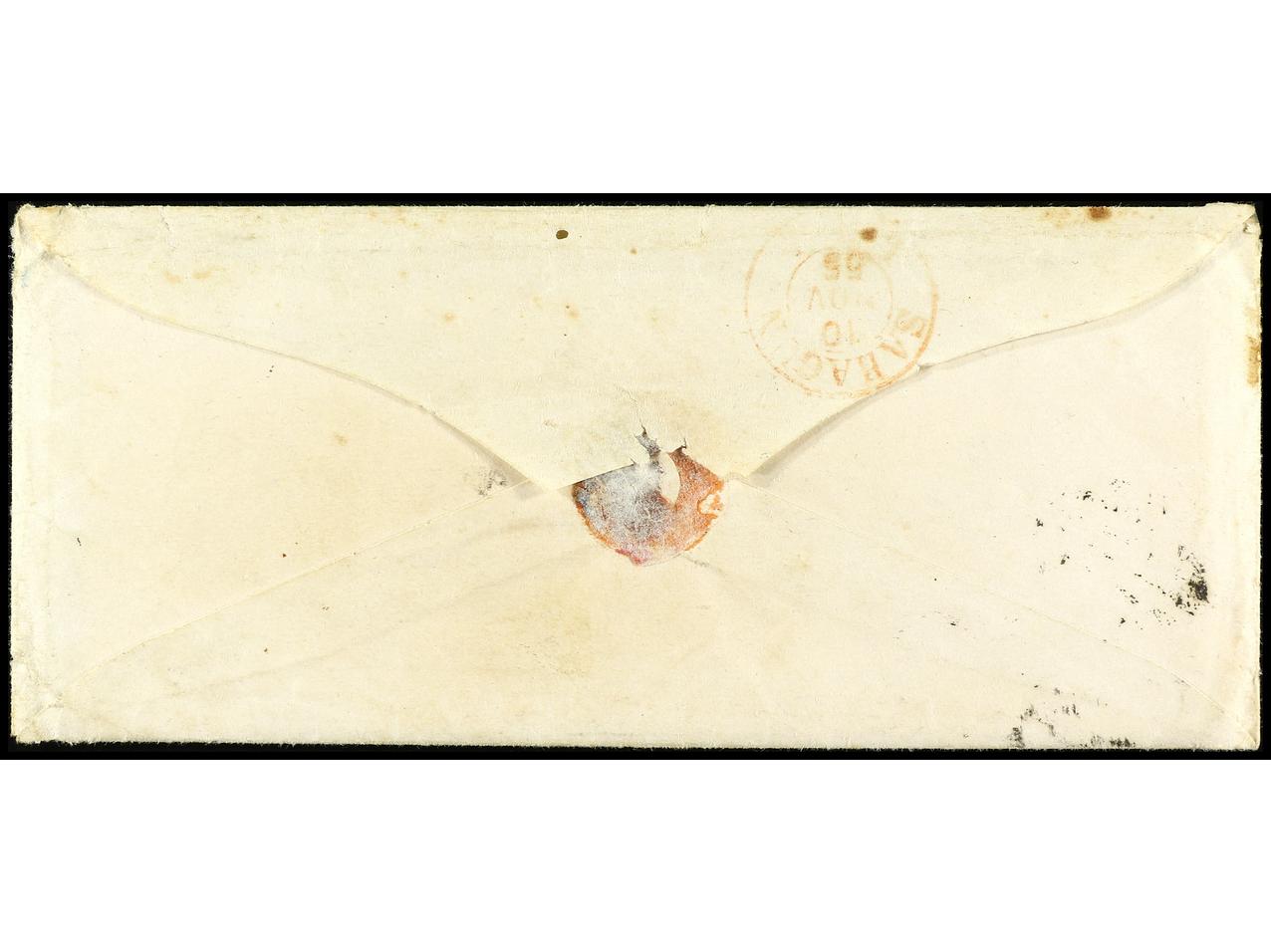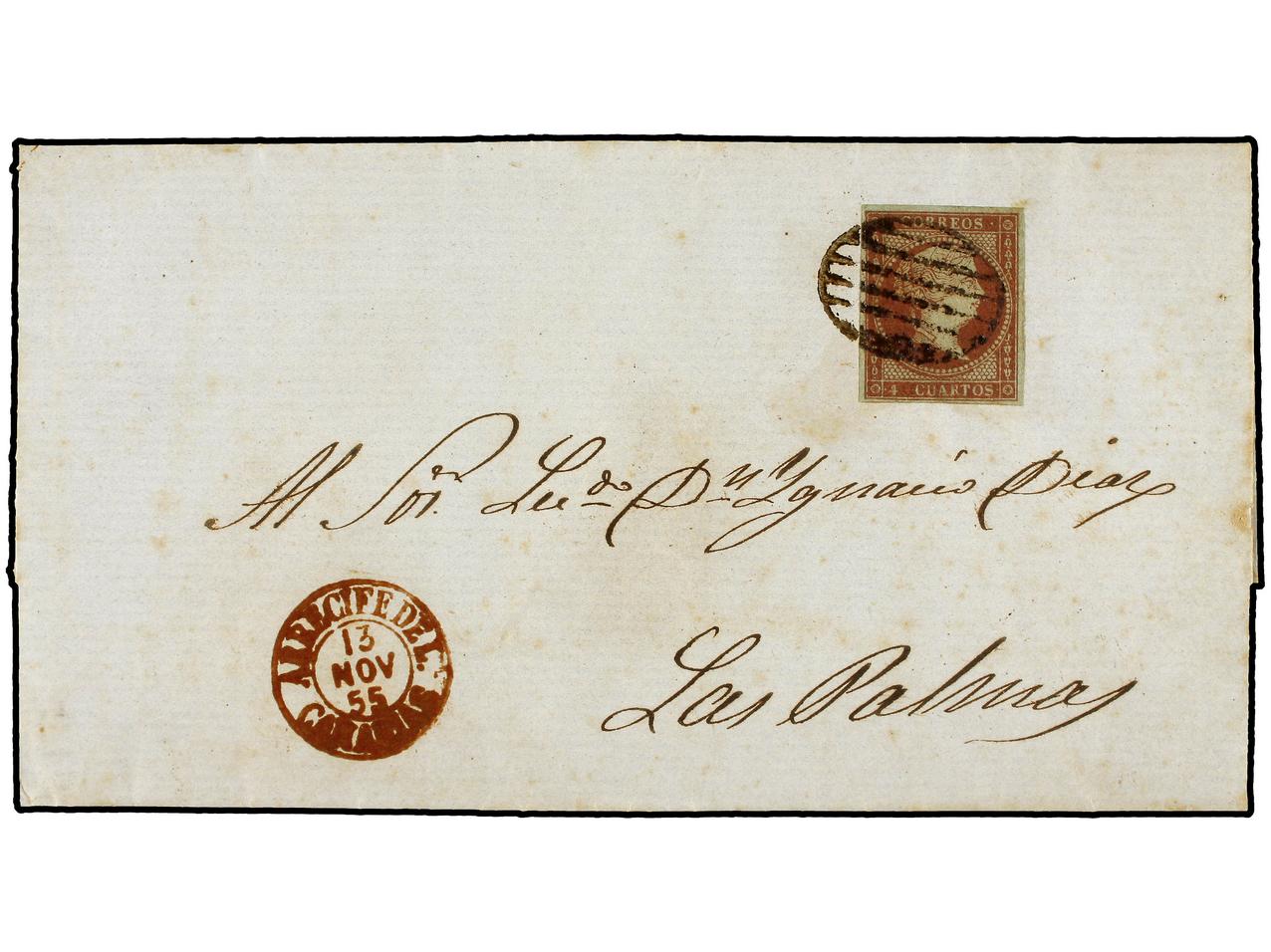 ESPAÑA. 1855 (14 Noviembre). ARRECIFE a LAS PALMAS. 4 cuartos rojo, mat. PARRILLA y fechador ARRECIFE DE L./CANARIAS. EXTRAORDINARIA y MUY RARA. ÚNICA CONOCIDA con éste franqueo circulada inter-islas pagando un doble porte. Ed.40. (Image1) (Image2)