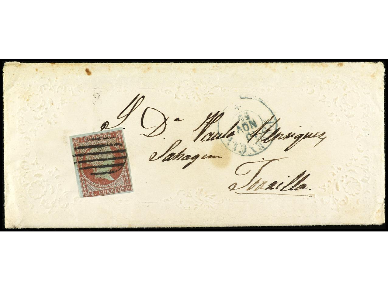 ESPAÑA. 1855. VALENCIA a SAHAGUN. 4 cuartos rojo en sobre ornamentado tipo ´Valentine´ en el interior hoja con los mismos ornamentos. Muy raro usado en España. Ed.40. (Image1) (Image2)