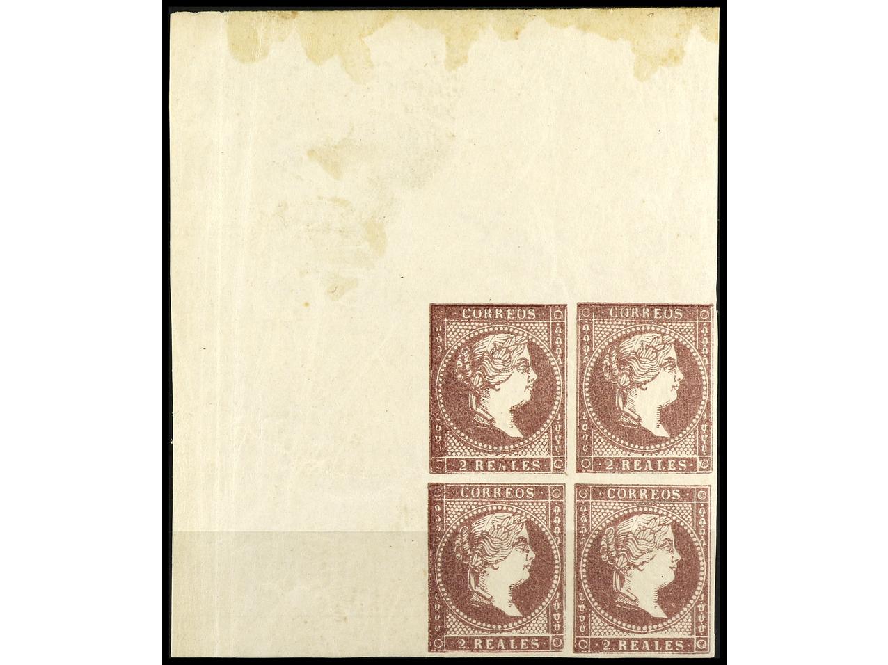 ESPAÑA. 1 real azul y 2 reales violeta. Bloques de cuatro esquina de pliego. Espectacular calidad. Ed.49/50 (4). (Image1)