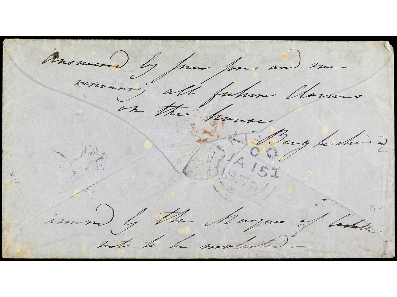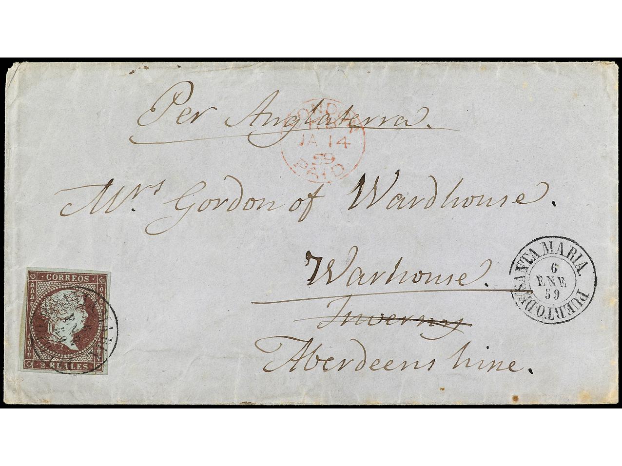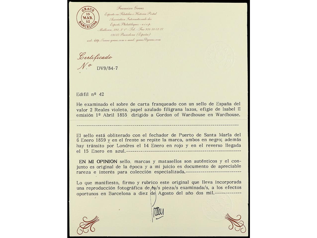 ESPAÑA. 1859. PUERTO SANTA MARÍA a ABERDEEN (Escocia). 2 reales lila. Mat. fechador PUERTO DE SANTA MARIA. Preciosa y RARO uso tardío del sello con filigrana lazos. Cert. GRAUS. Ed.42. (Image1) (Image2)