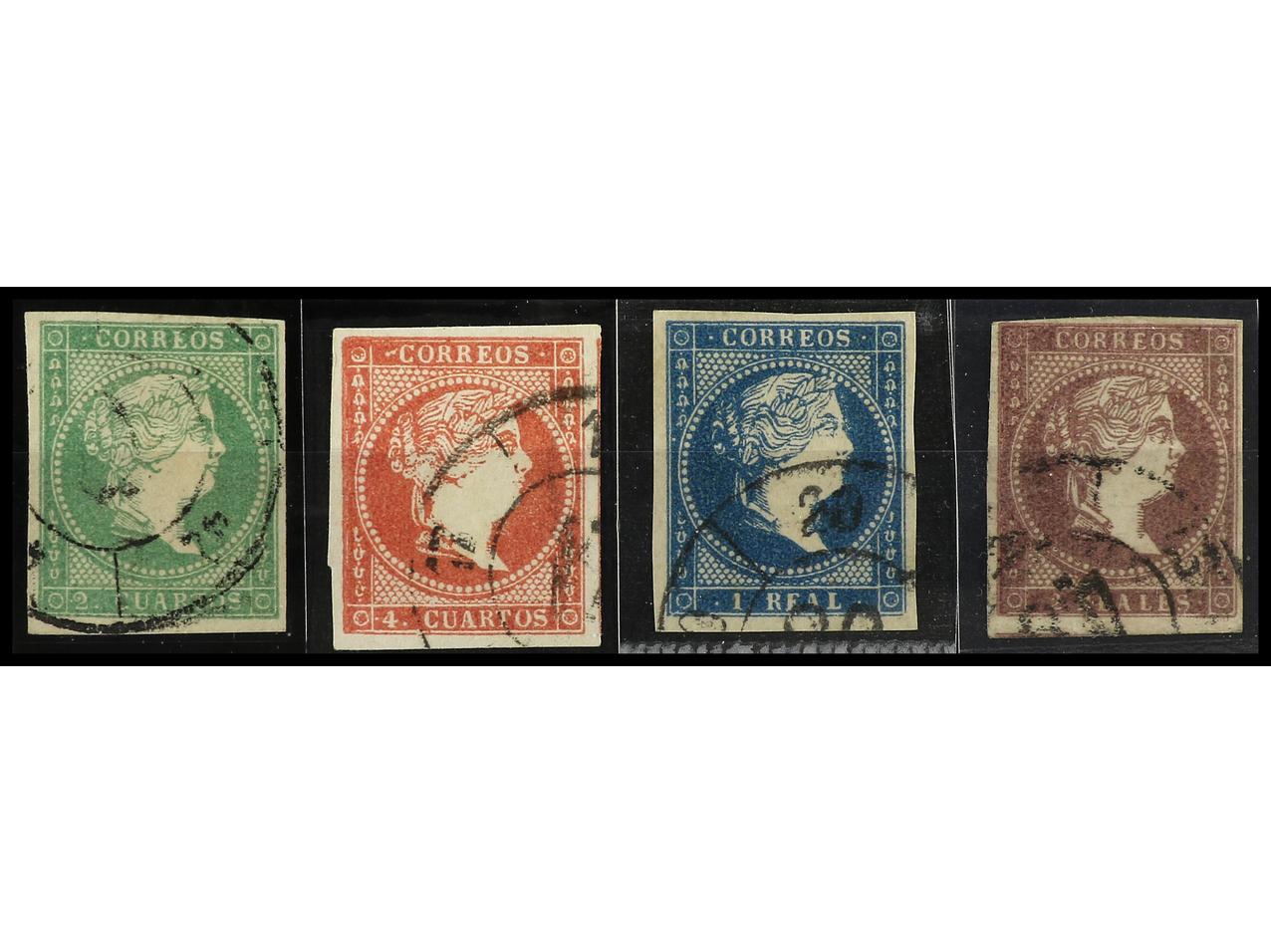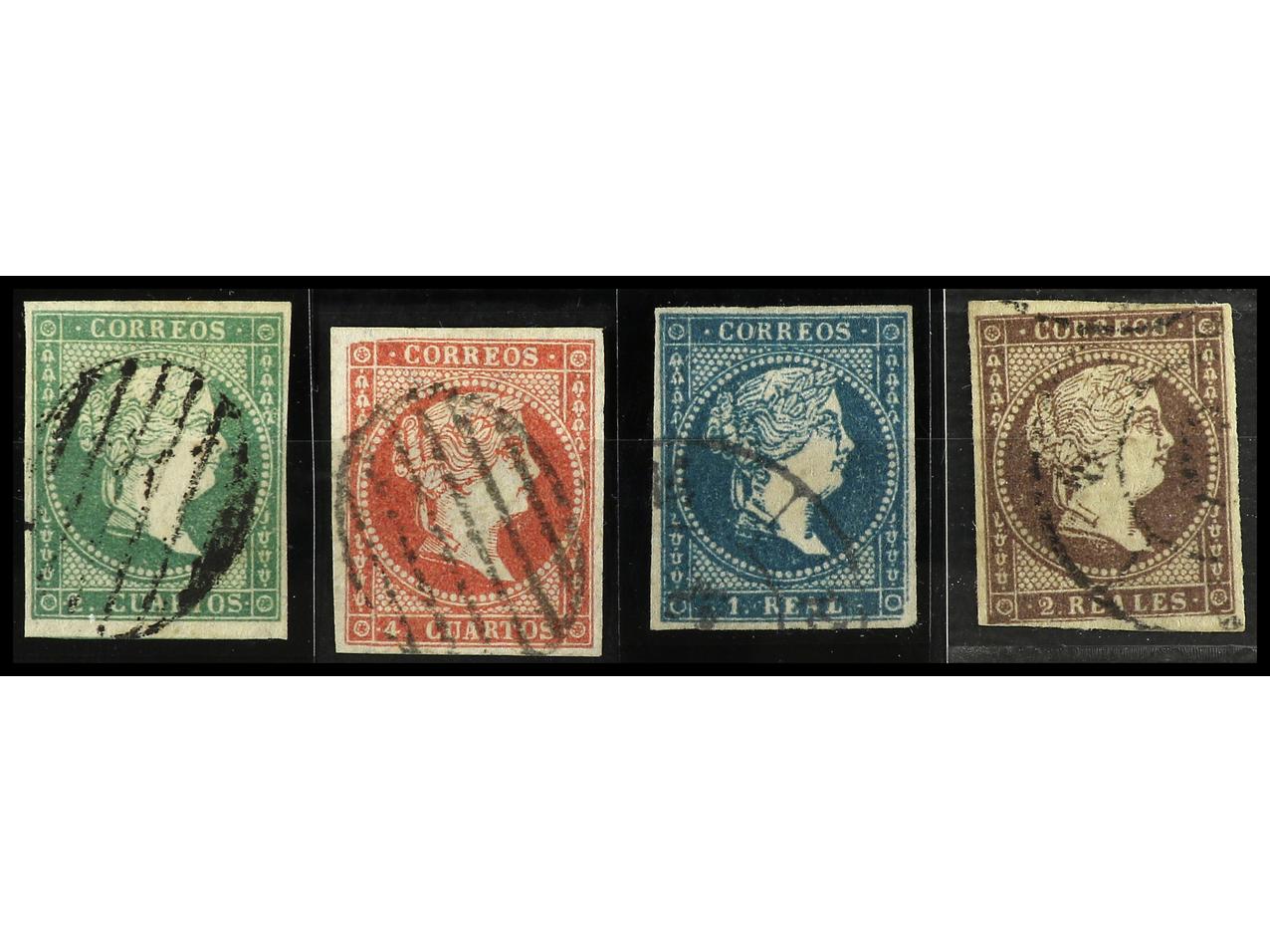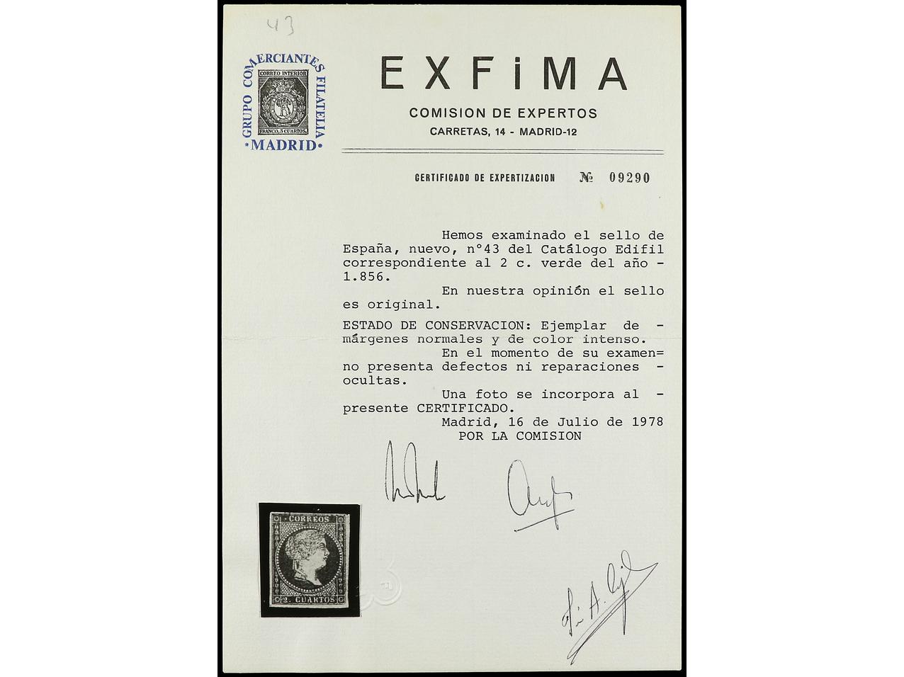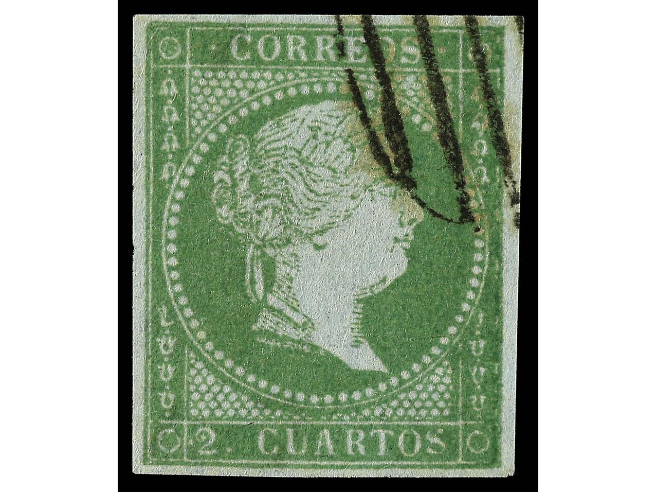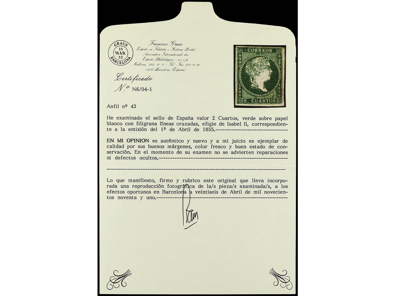 ESPAÑA. 2 cuartos verde. Tres amplios márgenes. Muy buen ejemplar. RARO. Cert. GRAUS. Ed.43. (Image1) (Image2)