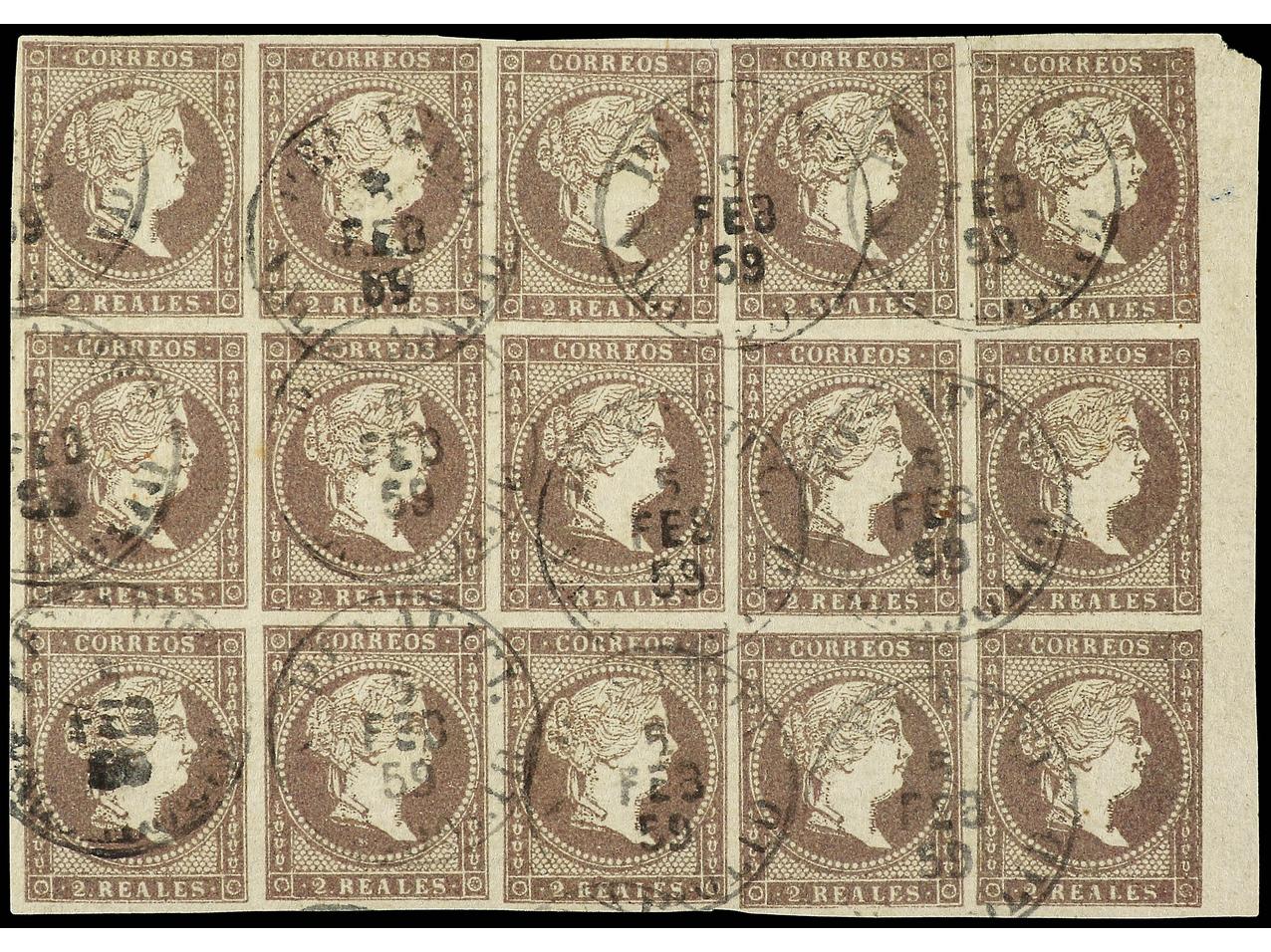 ESPAÑA. 2 reales violeta. Bloque de quince. Mat. fechador PLASENCIA/VALLADOLID. PRECIOSO. Ed.46 (15). (Image1)