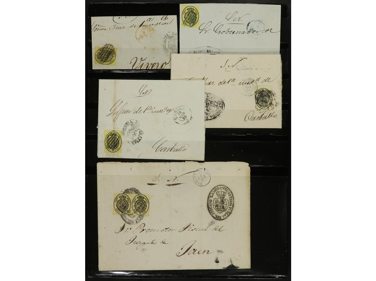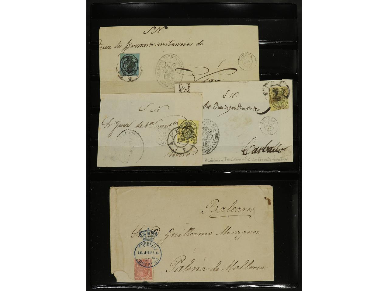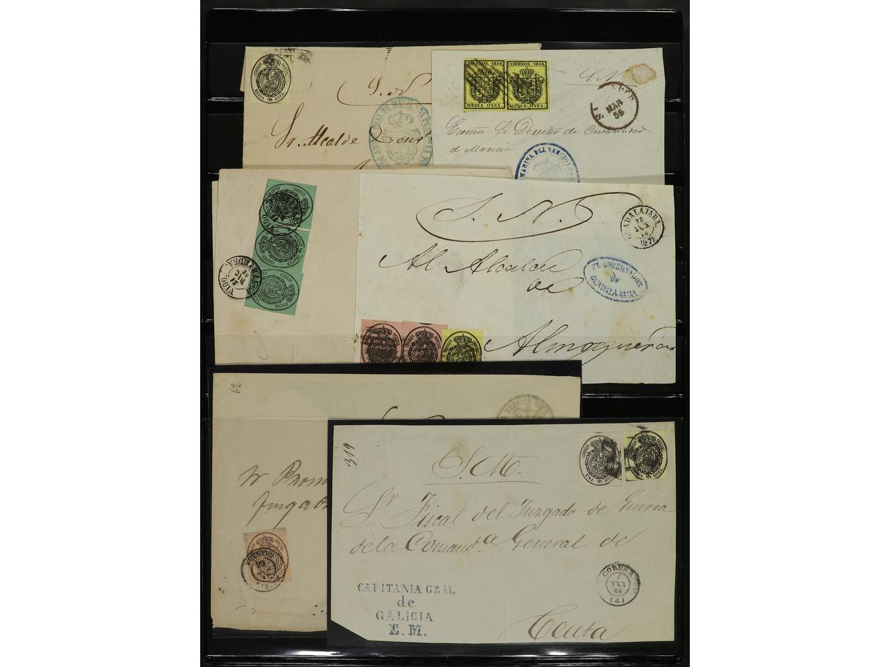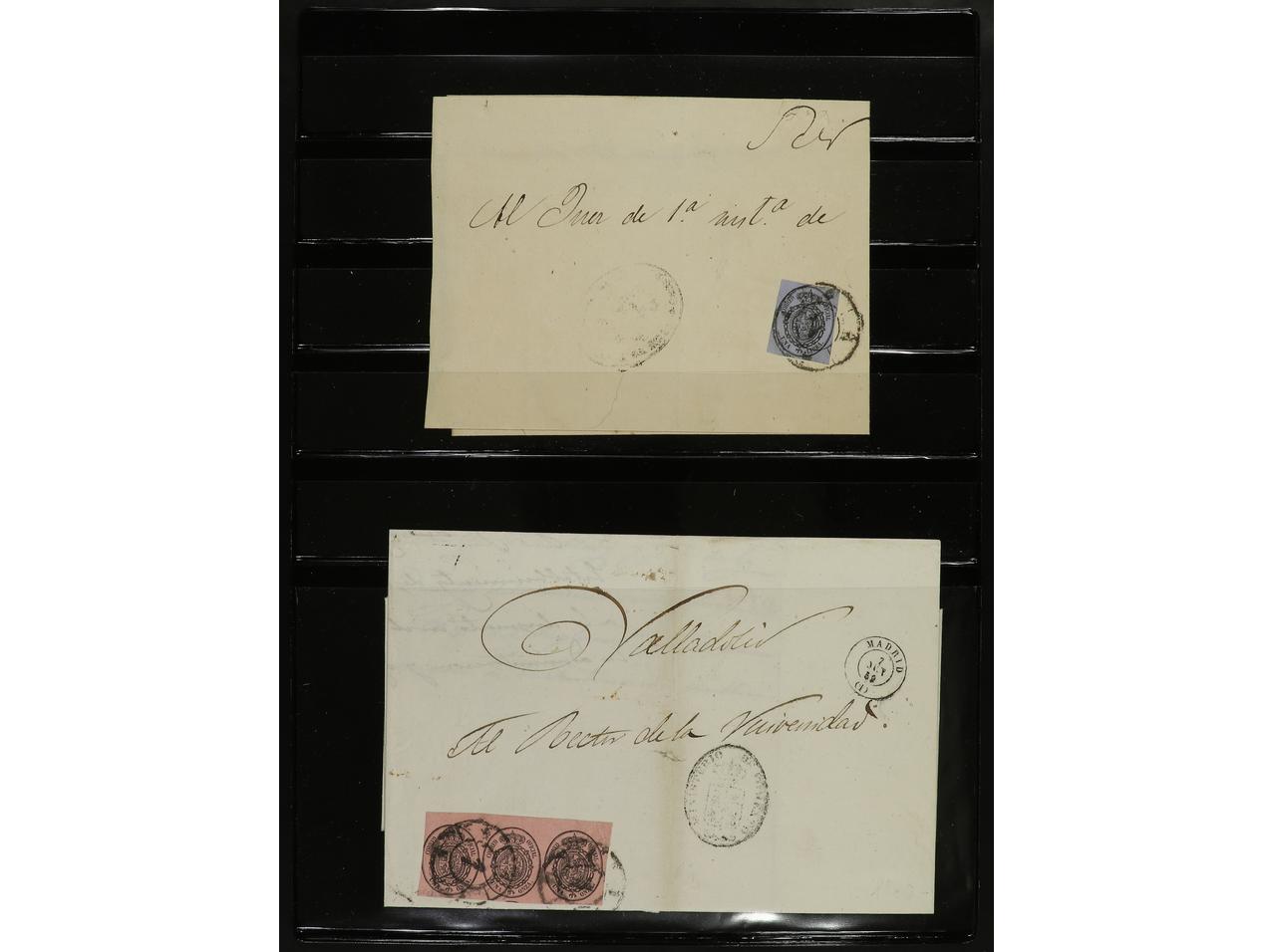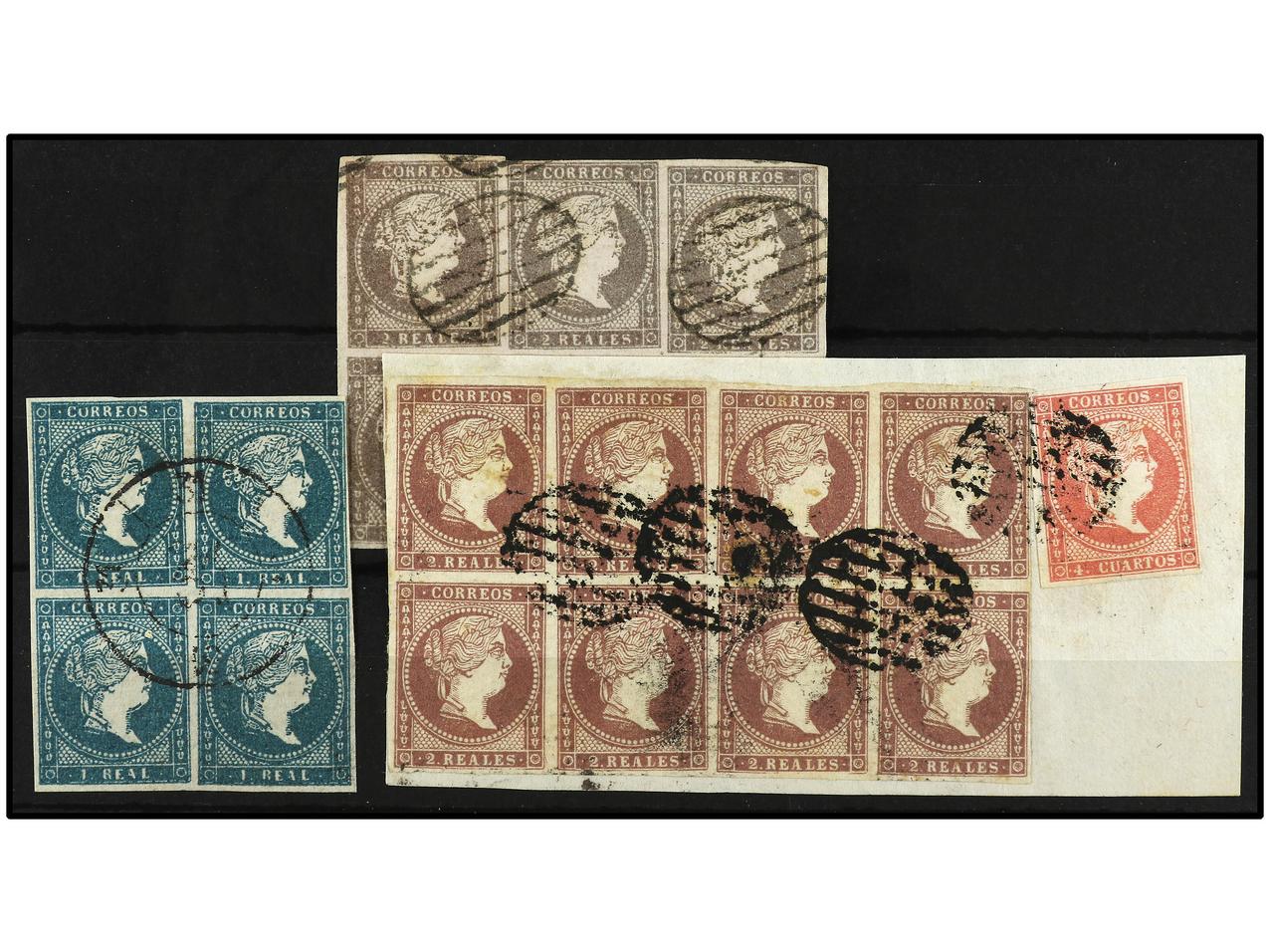 ESPAÑA. 1 real bloque de cuatro, 2 reales bloque de seis, fragmento con un bloque de ocho y sello de 4 cuartos. Ed.45, 46. (Image1)