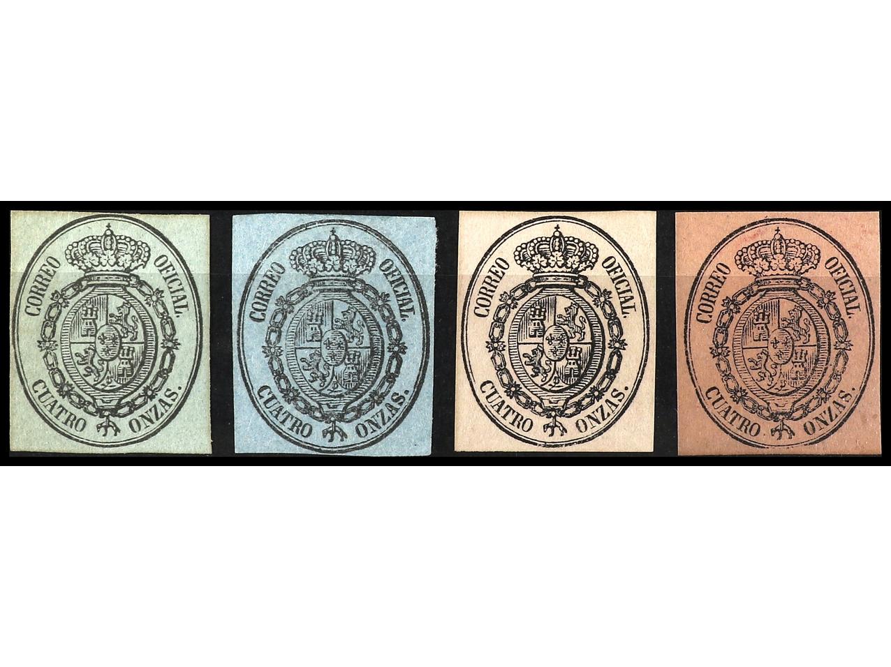 ESPAÑA. 4 onzas CAMBIOS DE COLOR DEL PAPEL. Cuatro sellos, verde amarillo, azul, rosa y rosa salmón. RARO CONJUNTO. Ed.37. (Image1)