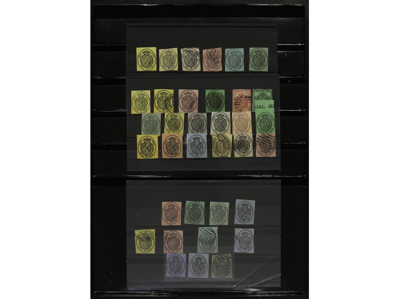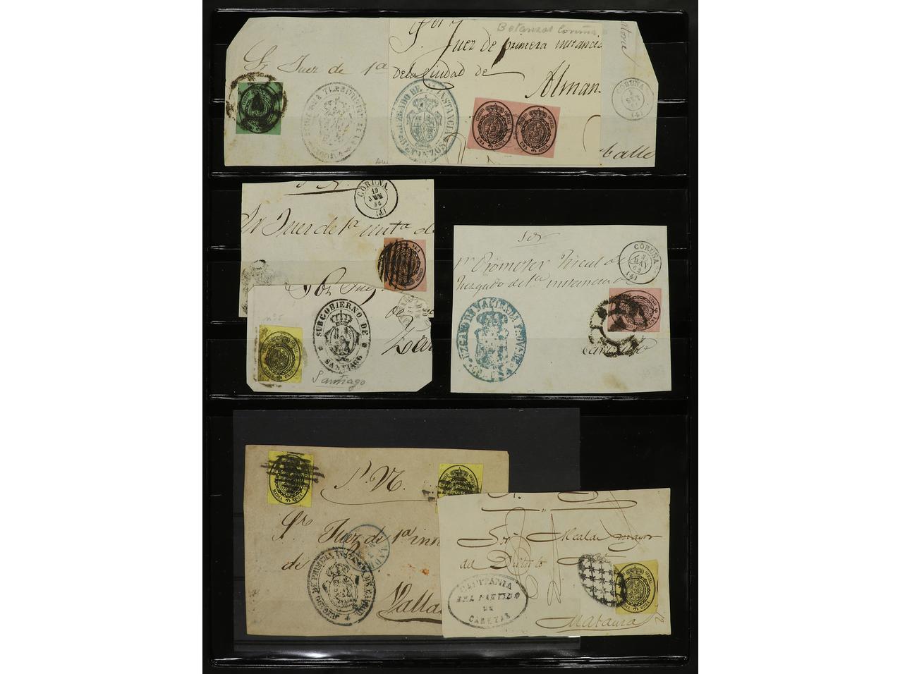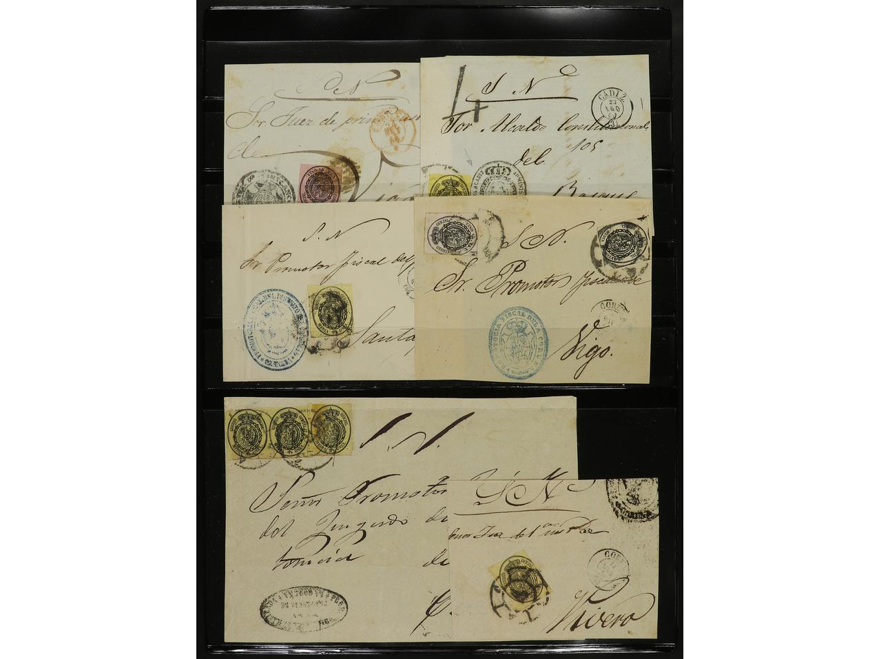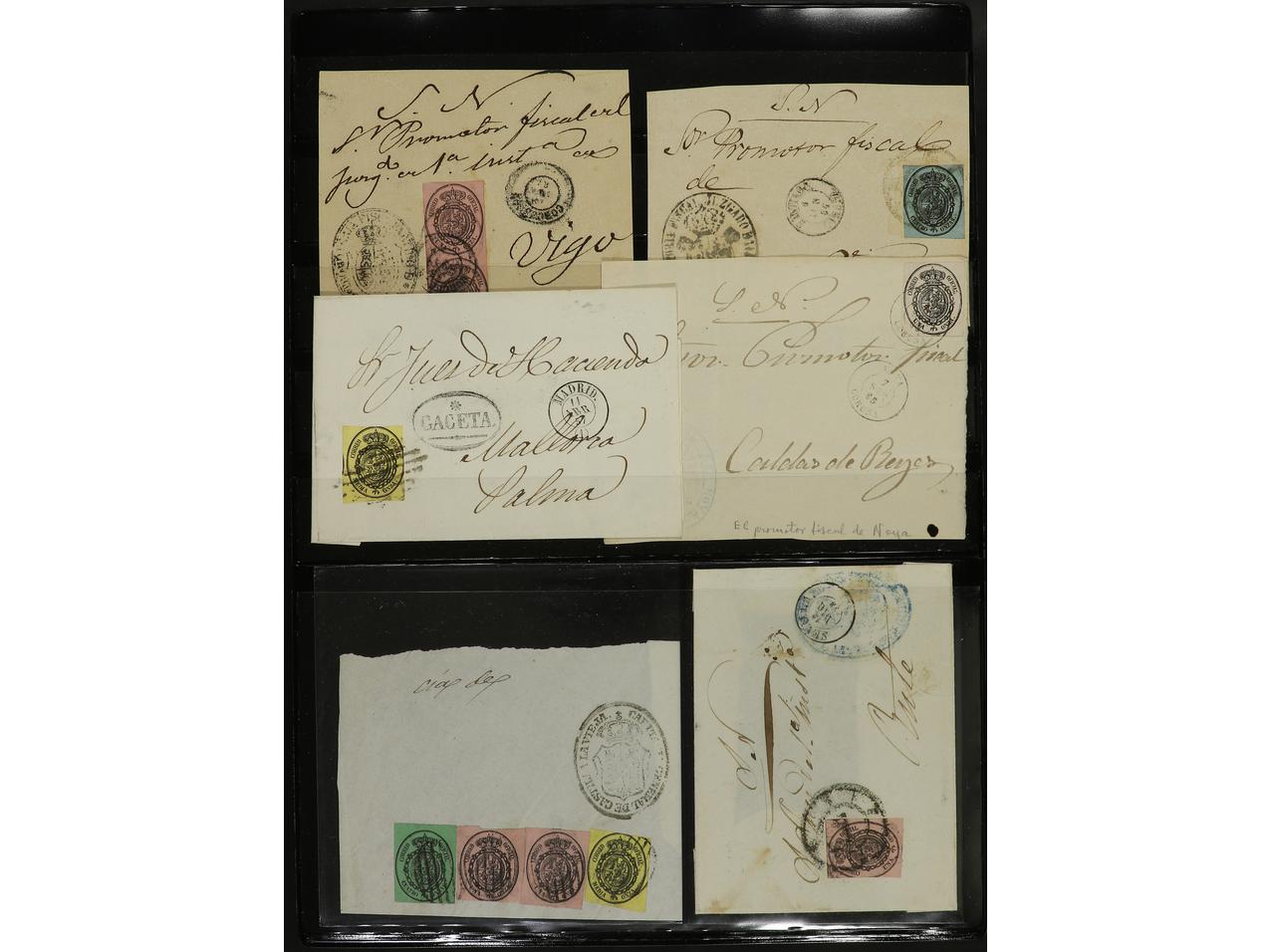 ESPAÑA. SERVICIO OFICIAL. Conjunto montado en hojas clasificador formado por +/- 90 sellos y 36 fragmentos o frontales, destacando sello de 1 libra (Ed. 38) en plica. Foto en web. (Image1) (Image2)