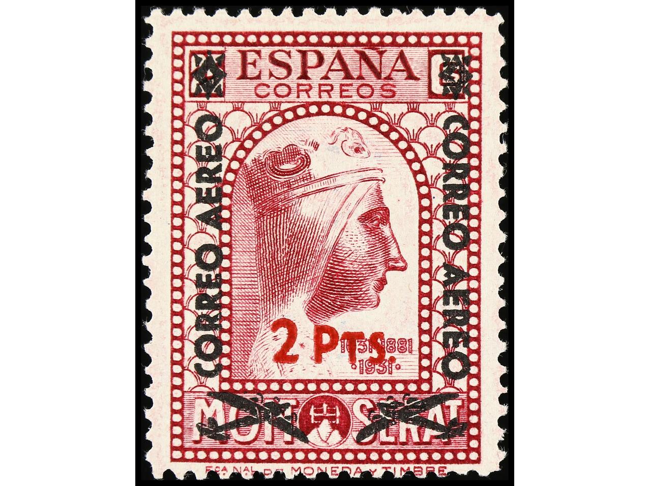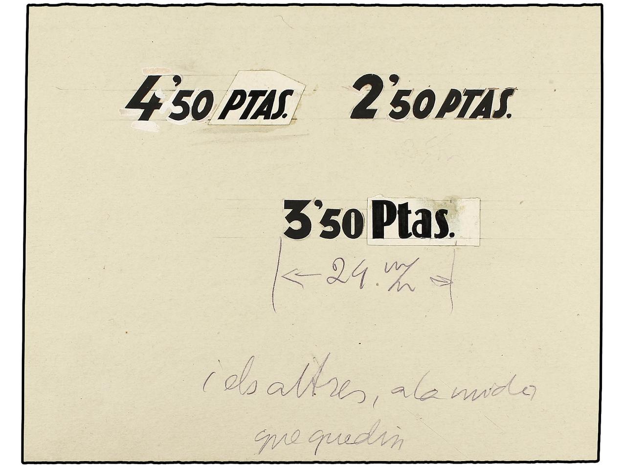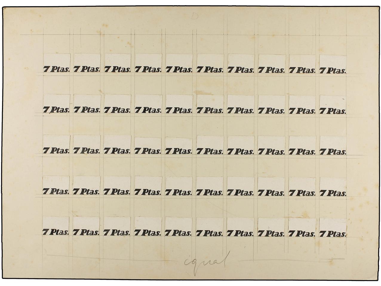 ESPAÑA. MAQUETA ORIGINAL para la estampación de la sobrecarga de 7 pesetas sobre los sellos de la serie de Montserrat. Hoja completa con 50 habilitaciones procedentes de los archivos de la imprenta Oliva y Vilanova. (Image1)