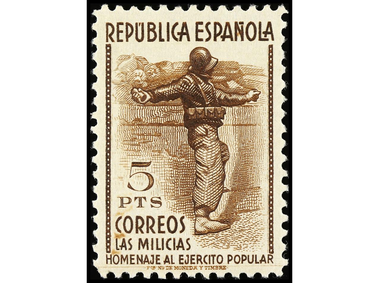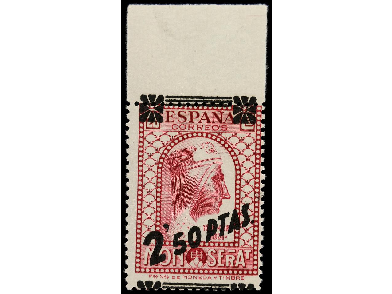 ESPAÑA. 45 cts. + 2 pts. Bloque de veinte sellos cabecera de pliego, numeración 06544 con los dos tipos de habilitación unidos. Estas hojas fueron cortadas, separando los 2 tipos de habilitación. Bloques completos son rarísimos, se